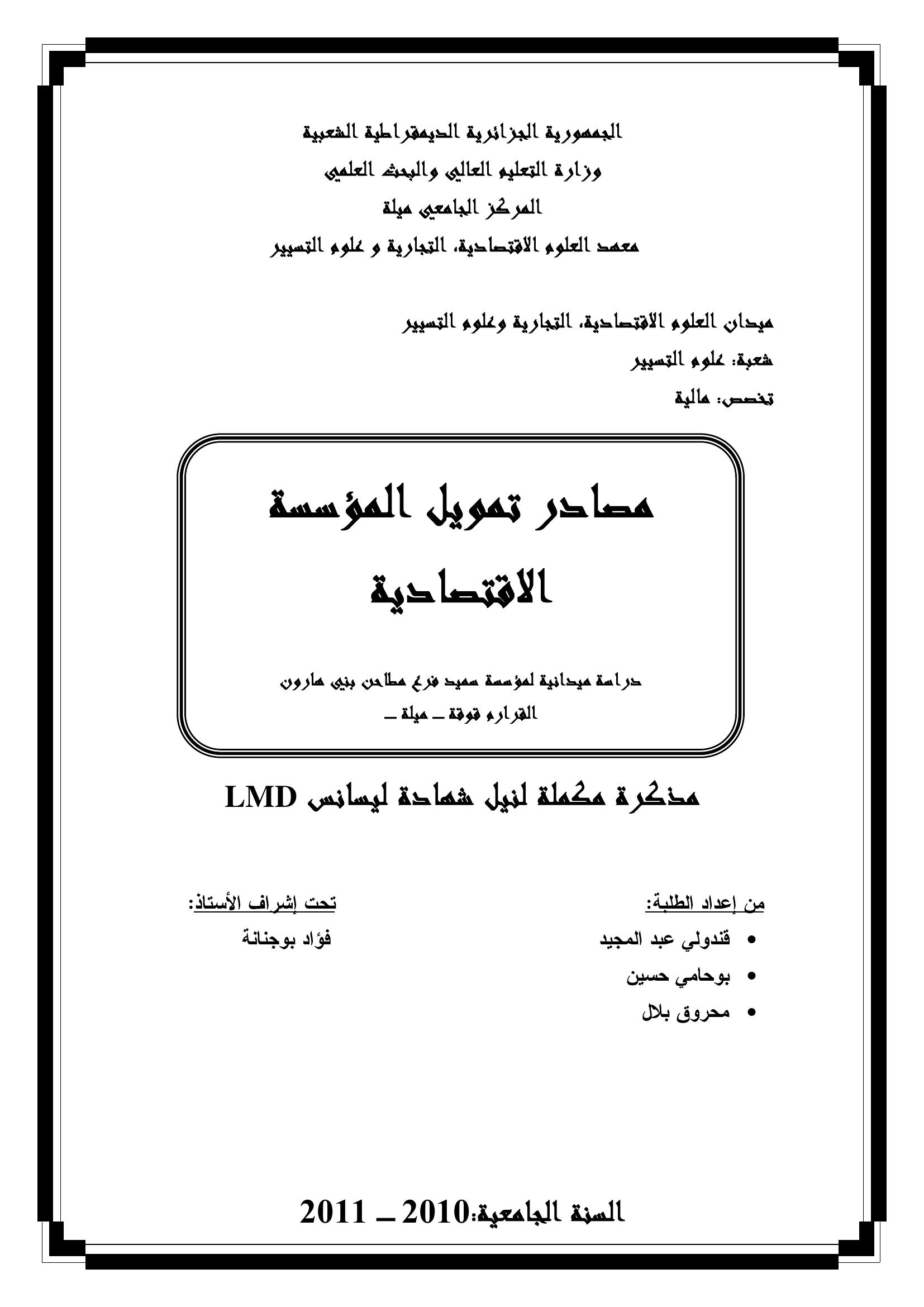 مصادر تمويل المؤسسة الإقتصادية دراسة ميدانية لمؤسسة سميد فرع مطاحن بني هارون