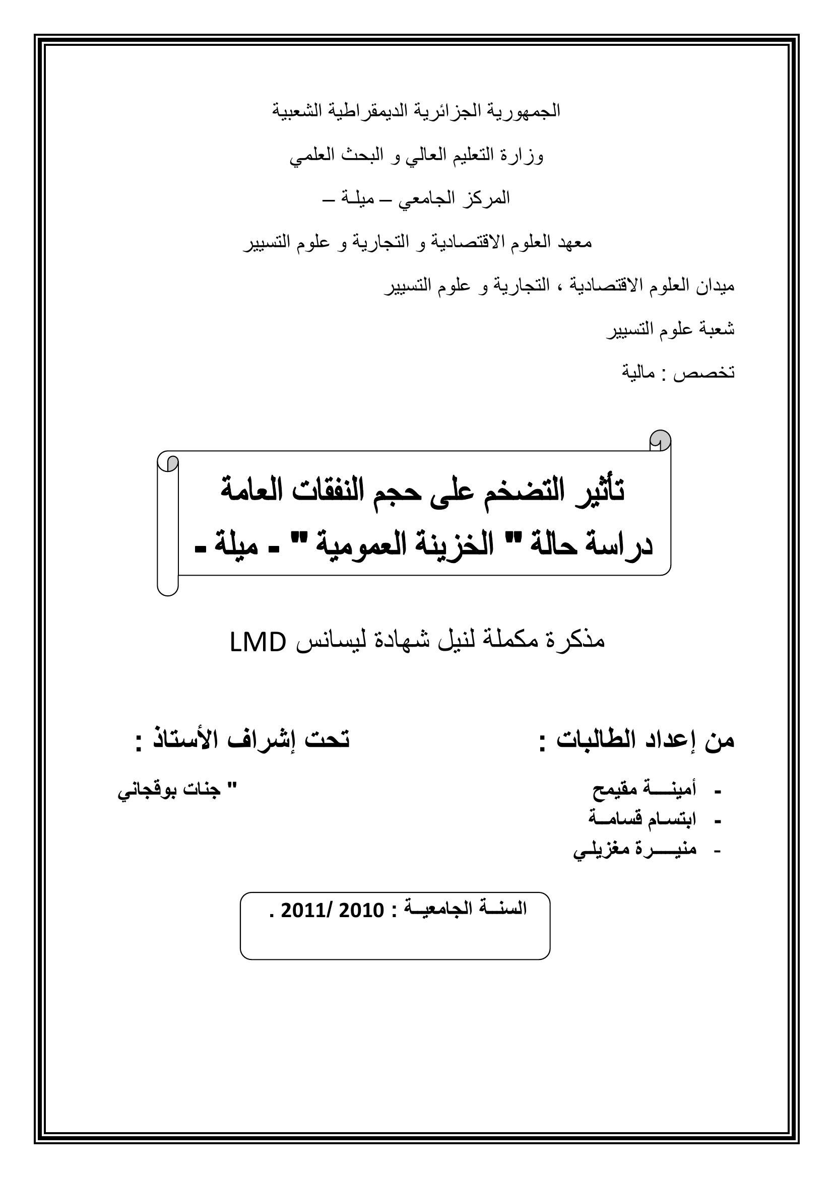 أمينة مقيمح & بوقجاني جنات (مشرفا) (2011). تأثير التضخم على حجم النفقات العامة دراسة حالة "الخزينة العمومية"-ميلة-.