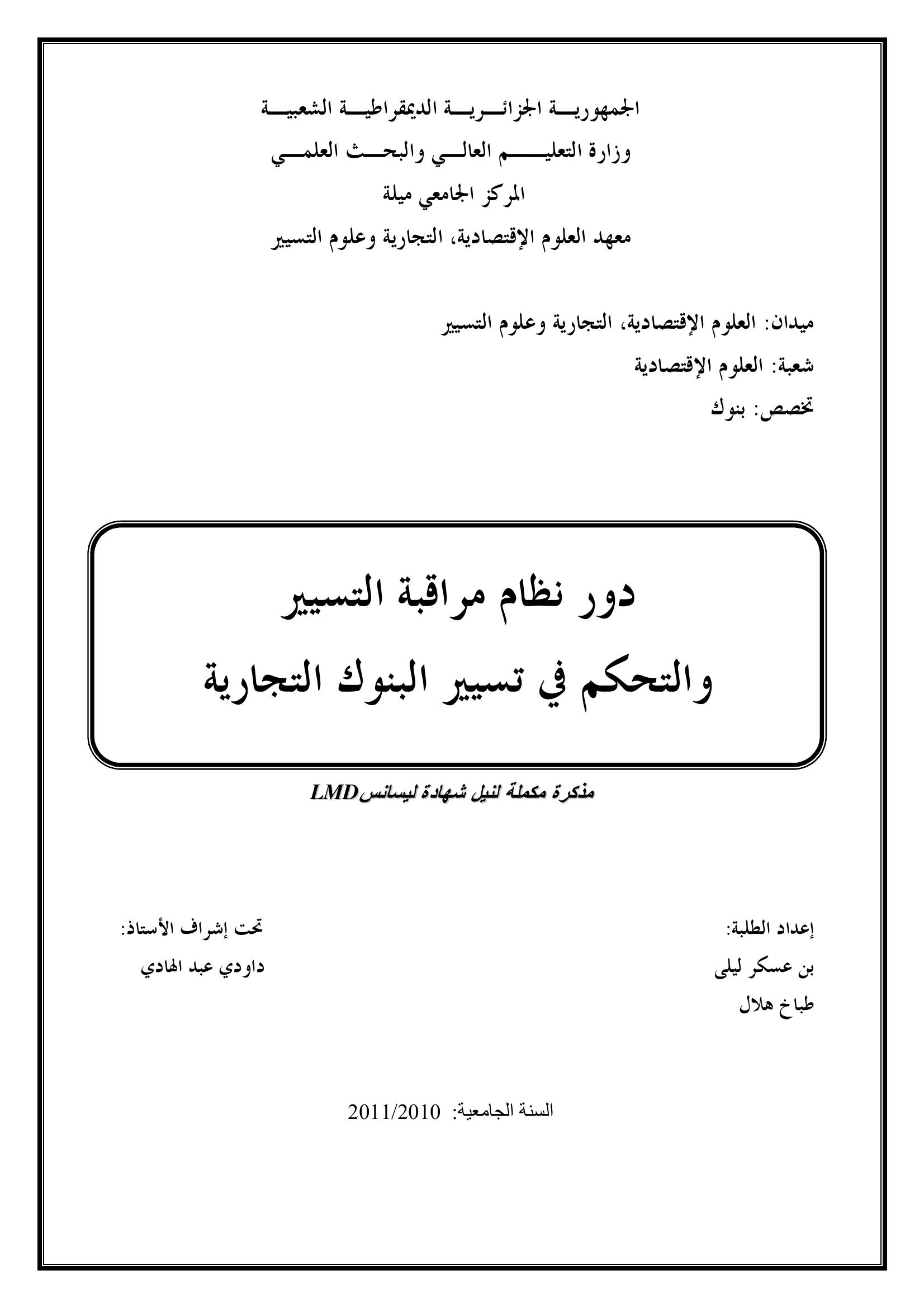 بن عسكر ليلى & داودي عبد الهادي (مشرفا) (2011). دور نظام مراقبة التسيير والتحكم في تسيير البنوك التجارية.