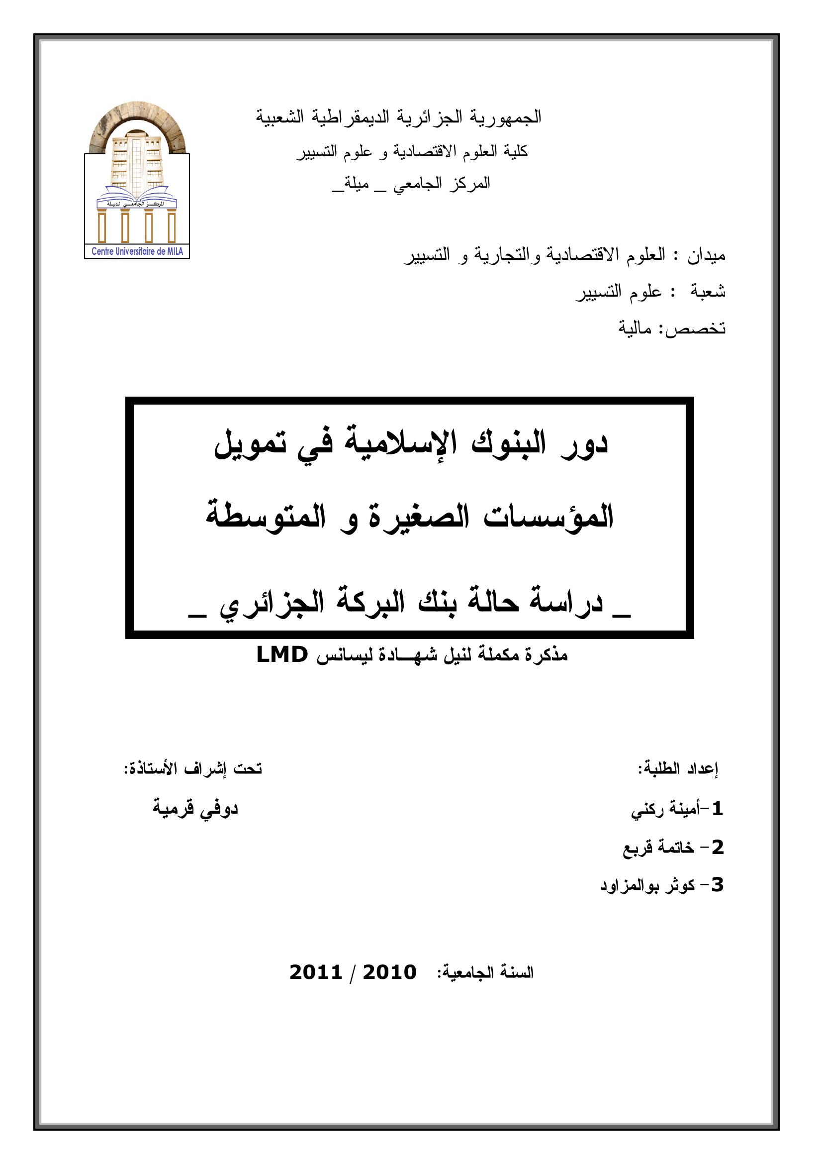 أمينة ركني & دوفي قرمية(مشرفا) (2011). دور البنوك الإسلامية في تمويل المؤسسات الصغيرة والمتوسطة -دراسة حالة بنك البركة الجزائري-.