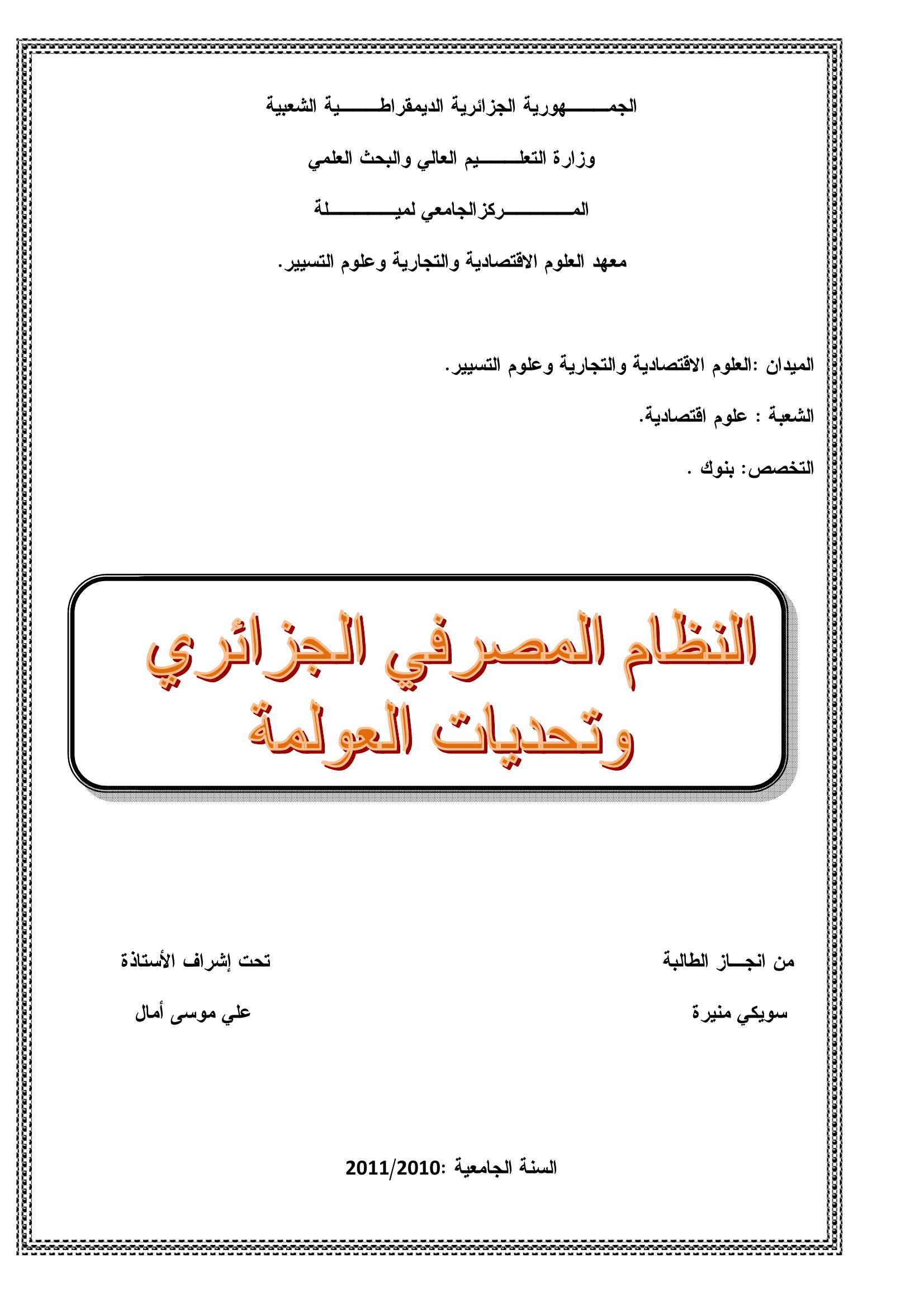 سويكي منيرة & علي موسى أمال (مشرفا) (2011). النظام المصرفي الجزائري و تحديات العولمة.
