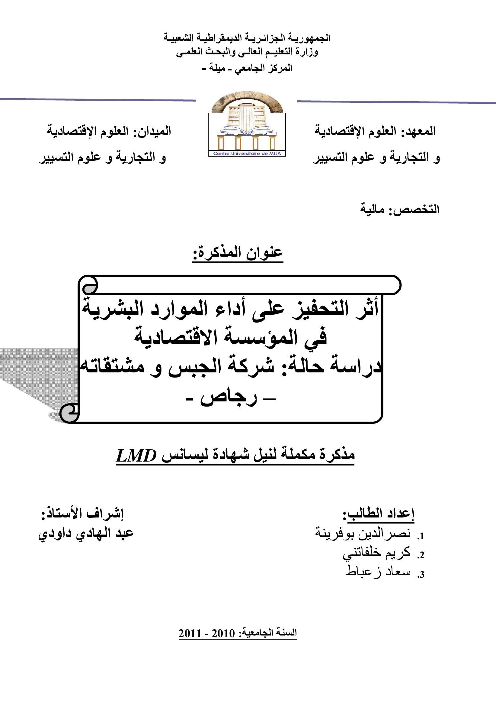أثر التحفيز على أداء الموارد البشرية في المؤسسة الإقتصادية دراسة حالة شركة الجبس و مشتقاته