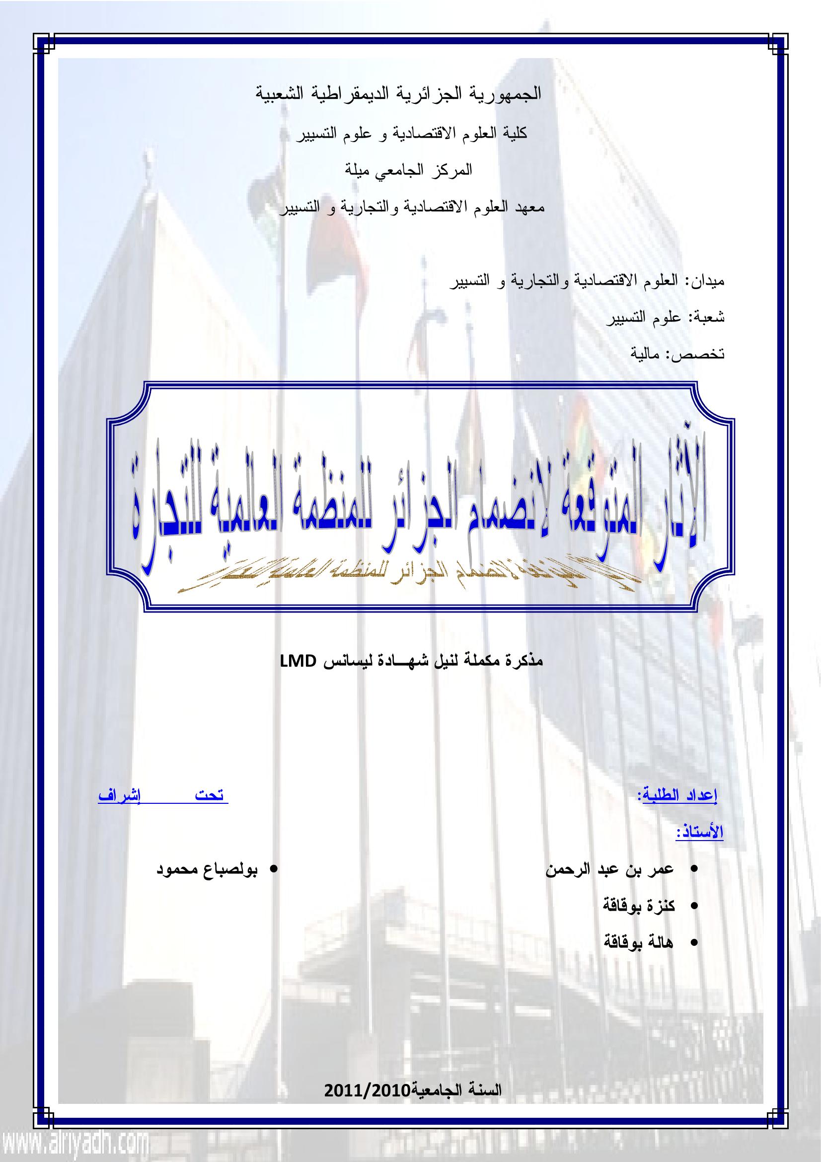 عمر بن عبد الرحمان & بولصباع محمود (مشرفا) (2011). الأثار المتوقعة لانضمام الجزائر للمنظمة العالمية للتجارة.