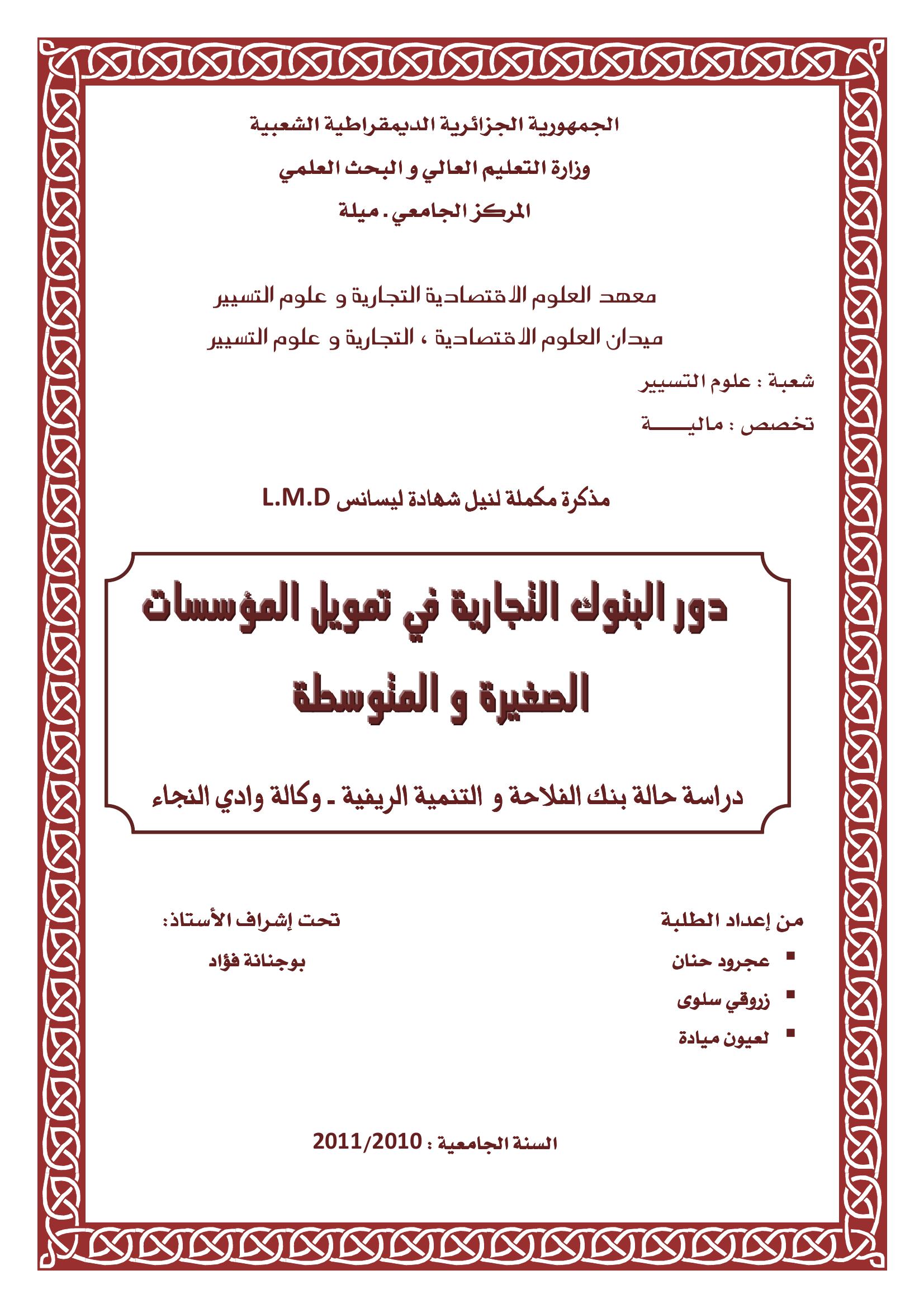 عجرود حنان & بوجنانة فؤاد (مشرفا) (2011). دور البنوك التجارية في تمويل المؤسسات الصغيرة و المتوسطة دراسة حالة بنك الفلاحة و التنمية الريفية - وكالة وادي النجاء -.