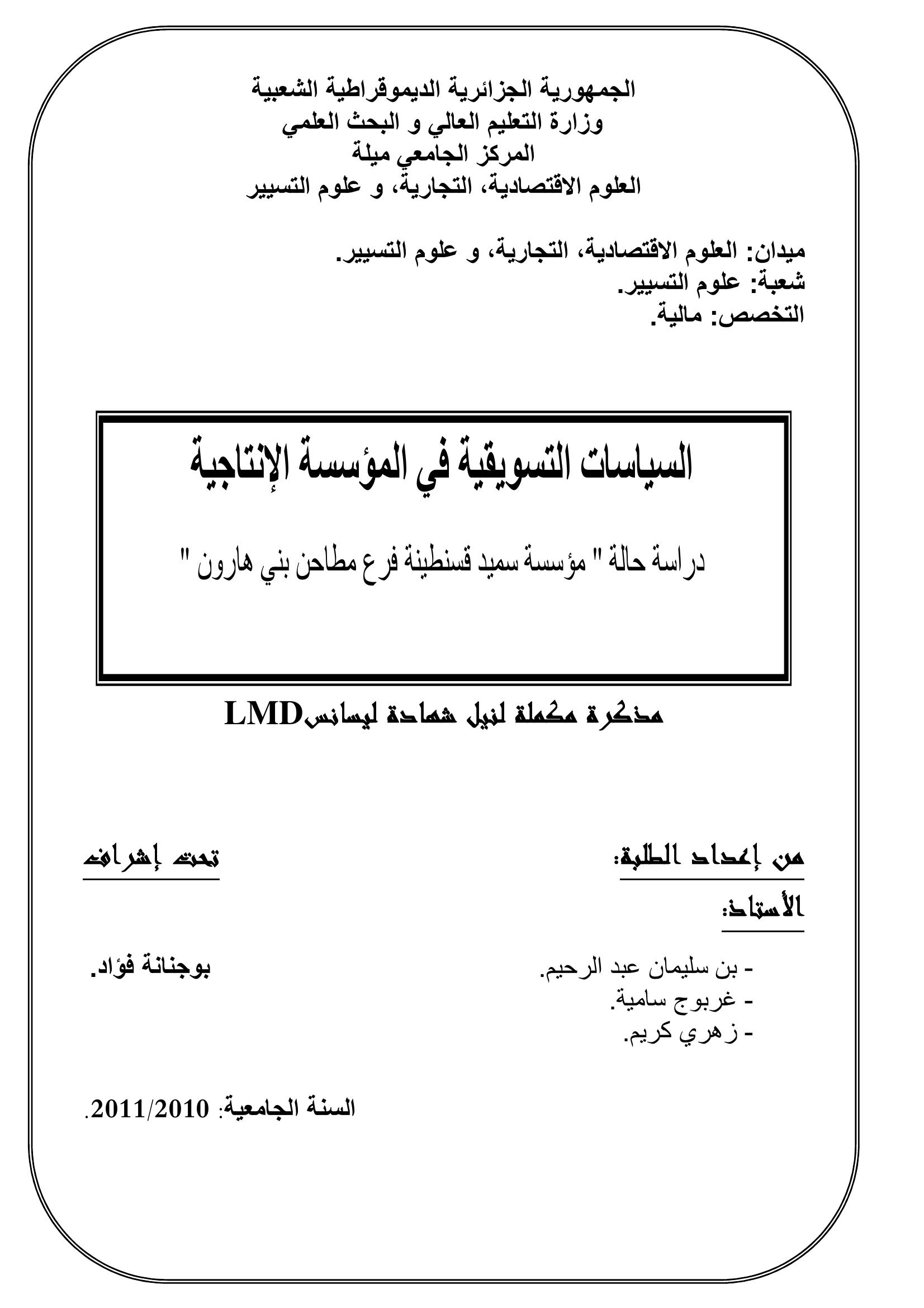 بن سليمان عبد الرحيم & بوجنانة فؤاد (مشرفا) (2011). واقع السياسات التسويقية في المؤسسة الإقتصادية الإنتاجية دراسة حالة "مؤسسة سميد قسنطينة فرع مطاحن بني هارون.