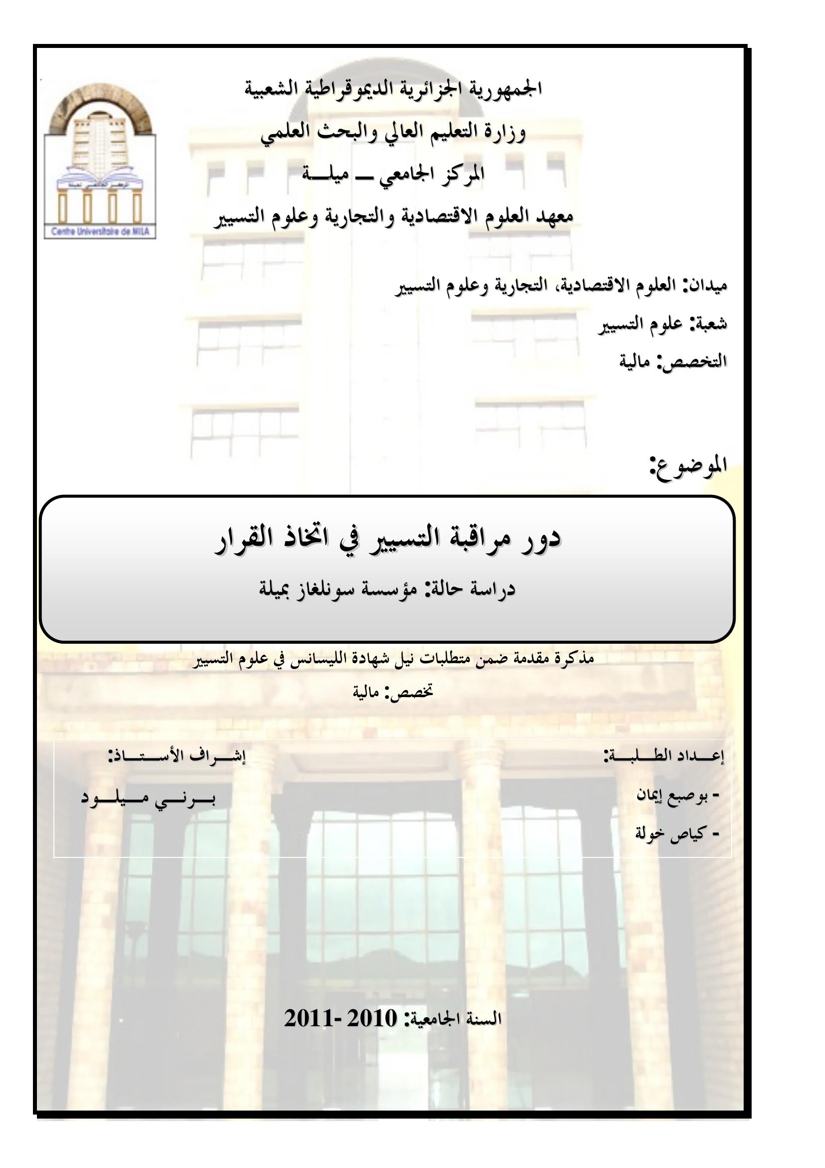 دور مراقبة التسيير في إتخاذ القرار دراسة حالة مؤسسة سونلغاز بميلة