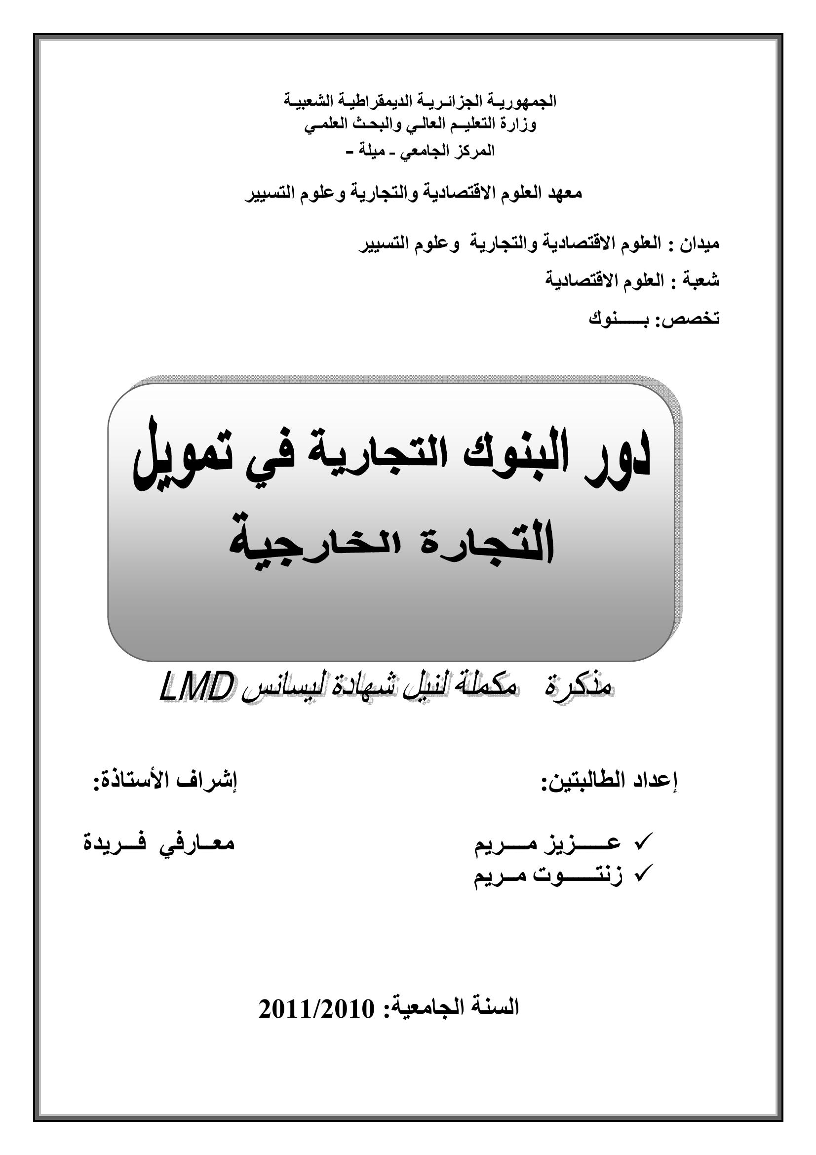 عزيز مريم & فريدة معارفي(مشرفا) (2011). دور البنوك التجارية في تمويل التجارة الخارجية.