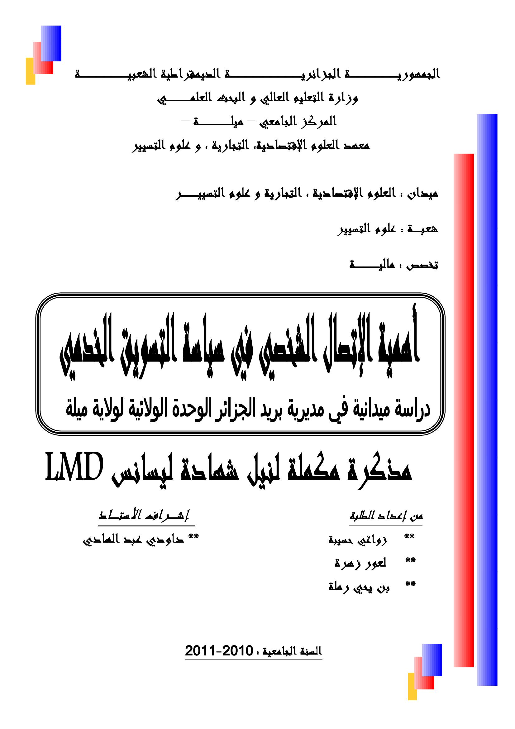 زواغي حسيبة & داودي عبد الهادي (مشرفا) (2011). أهمية الإتصال الشخصي في سياسة التسويق الخدمي دراسة ميدانية في مديرية بريد الجزائر الوحدة الولائية لولاية ميلة.