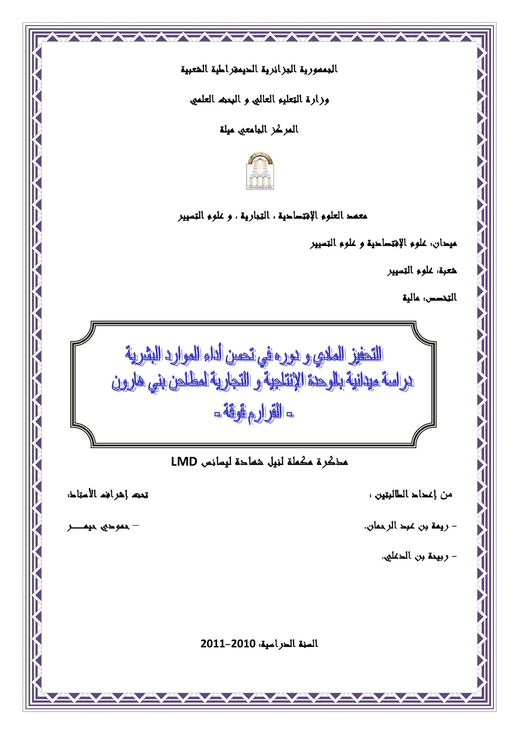 ربيحة بن الدعلي & حيمر حمودي (مشرفا) (2011). التحفيز المادي ودوره في تحسن الموارد البشرية دراسة ميدانية بالوحدة الإنتاجية والتجارية.