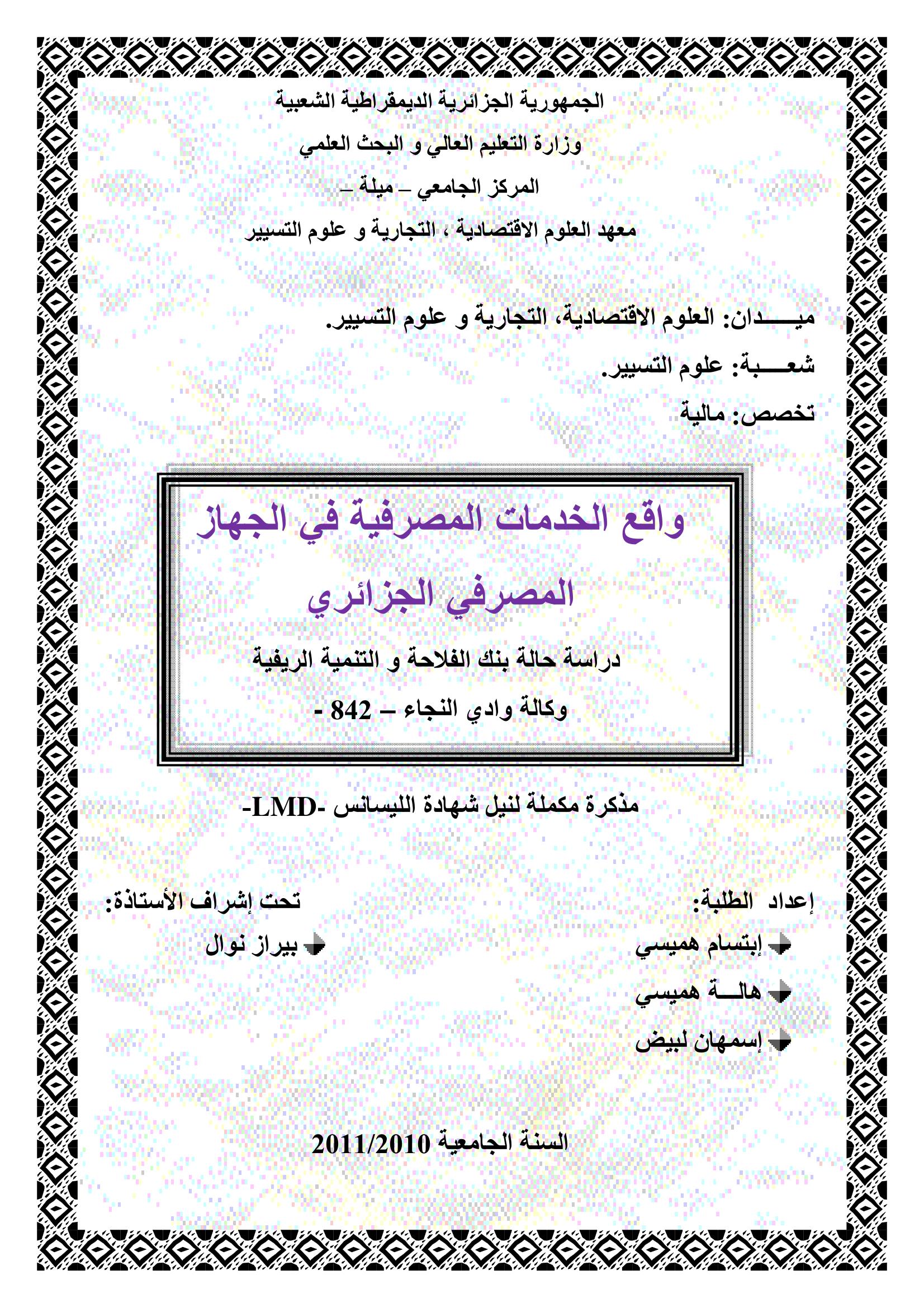 إبتسام هميسي & بيراز نوال(مشرفا) (2011). واقع الخدمات المصرفية في الجهاز المصرفي الجزائري دراسة حالة بنك الفلاحة والتنمي الريفية وكالة وادي النجاء 842.