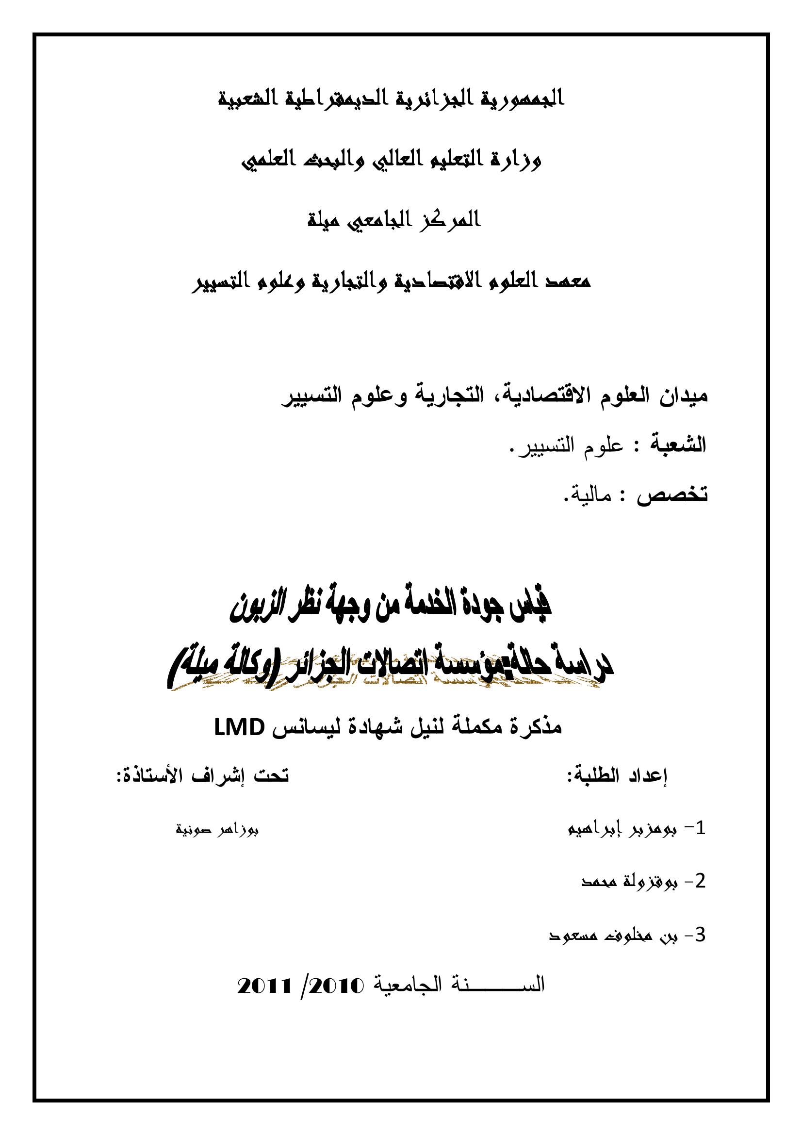 بومزبر إبراهيم & باديس نبيلة (مشرفا) (2011). قياس جودة الخدمة من وجهة نظر الزبون دراسة حالة مؤسسة اتصالات الجزائر وكالة ميلة.