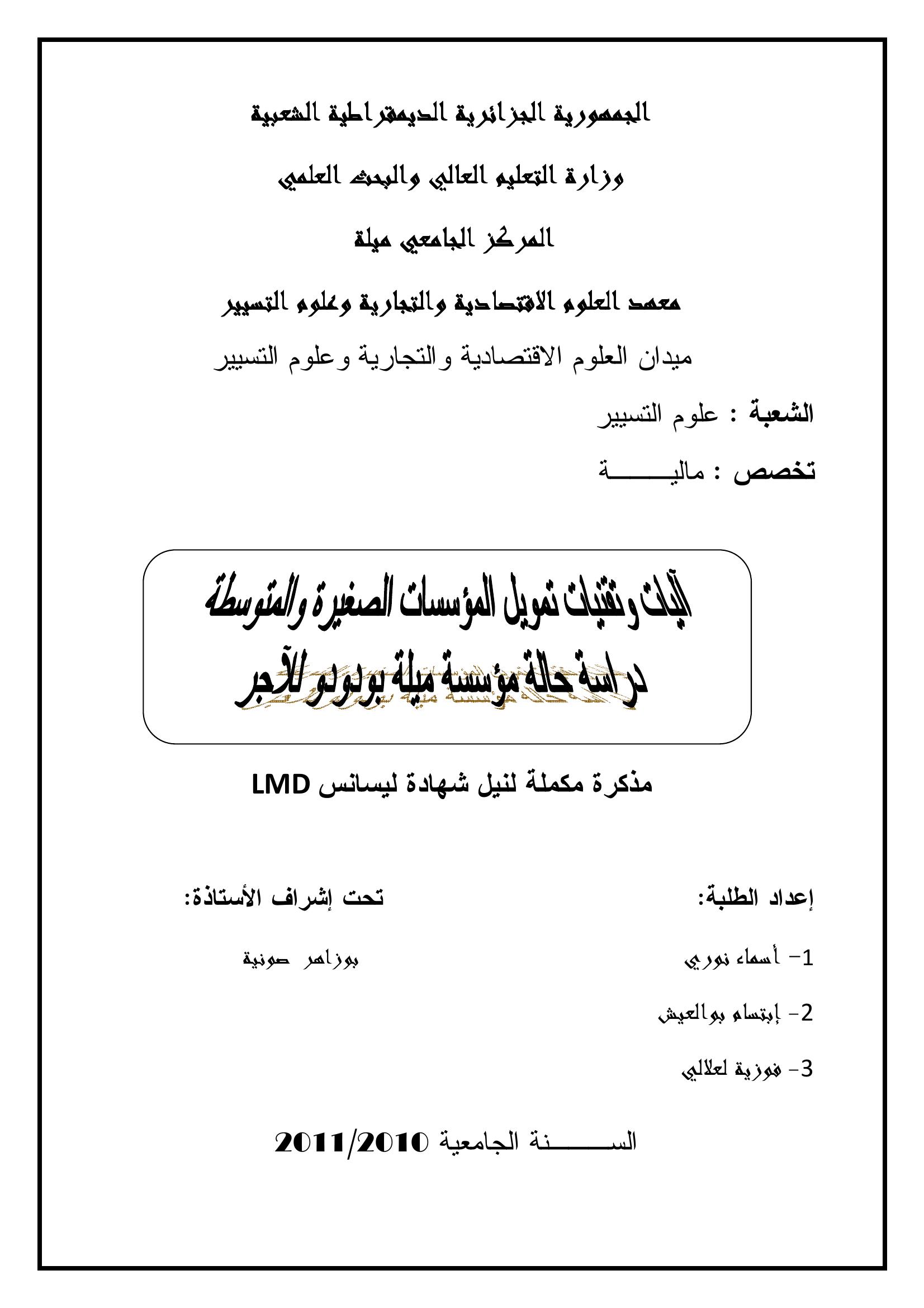 أسماء نوري & بوزاهر صونية(مشرفا) (2011). آليات وتقنيات تمويل المؤسسات الصغيرة والمتوسطة دراسة حالة مؤسسة ميلة بودودو للآجر.