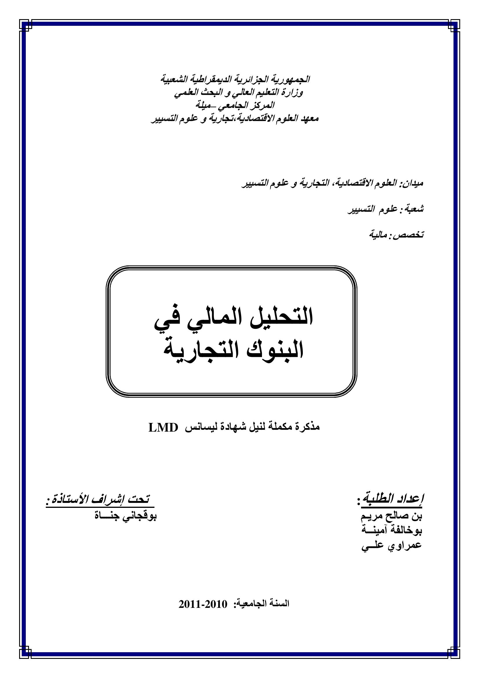 بن صالح مريم & بوقجاني جنات (مشرفا) (2011). التحليل المالي في البنوك التجارية.