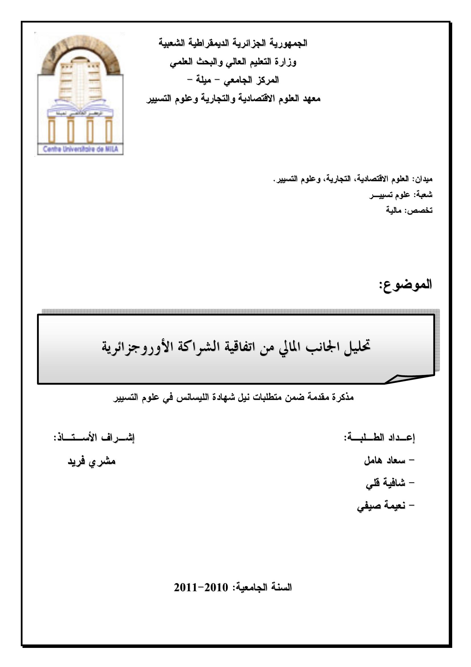 سعاد هامل & ،مشري فريد(رئيسا)،زواري فرحات سليمان(مناقشا)،قطاف عقبة(مشرفا ومقررا) (2011). تحليل الجانب المالي من إتفاقية الشراكة الأوروجزائرية.