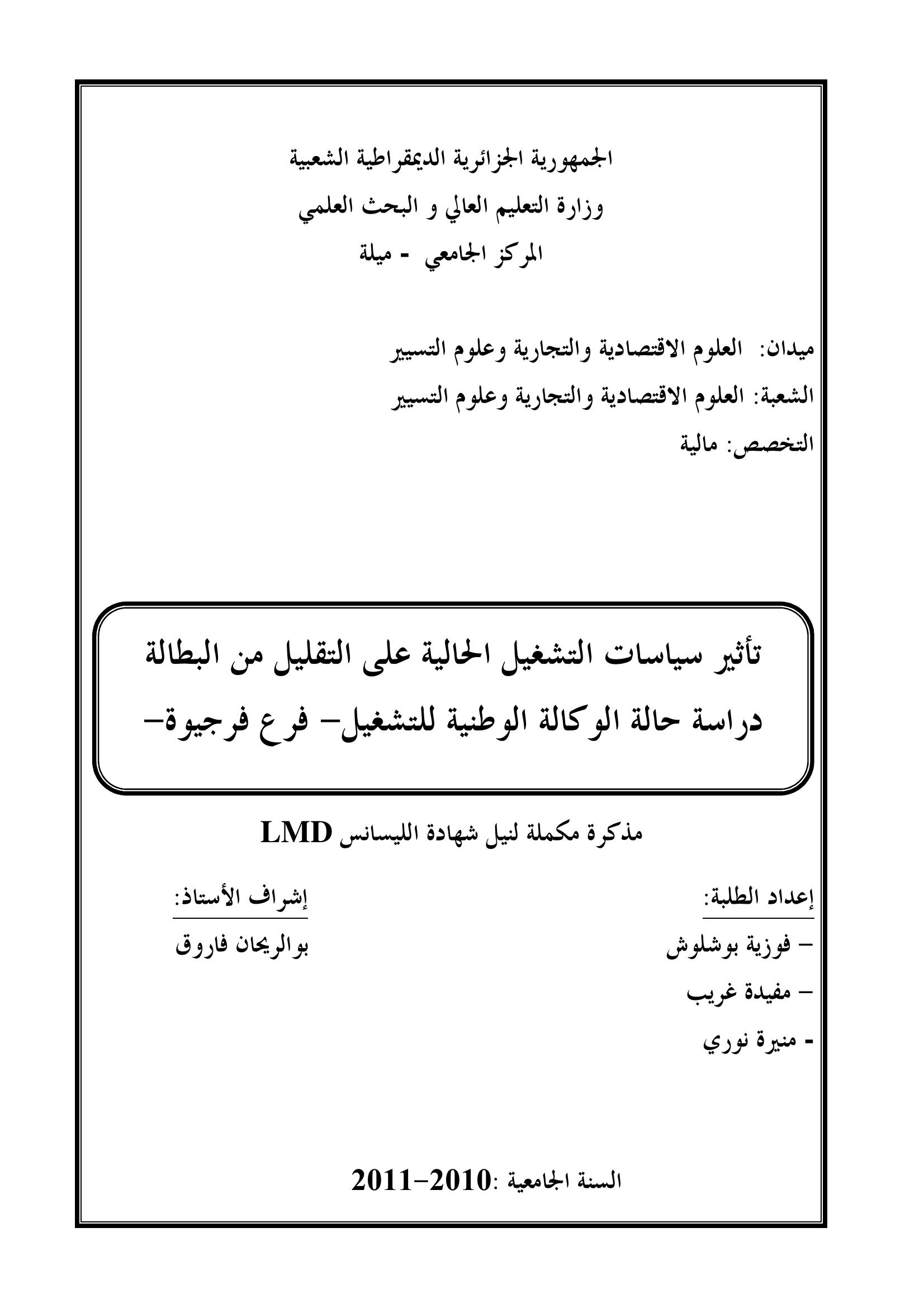 فوزية بوشلوش & بوالريحان فاروق (مشرفا) (2011). تأثير سياسات التشغيل الحالية على التقليل من البطالة دراسة حالة الوكالة الوطنية للتشغيل فرع فرجيوة.