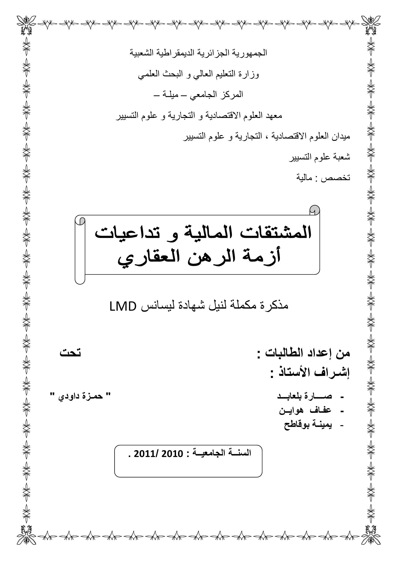 بلعابد صارة & داودي حمزة (مشرفا) (2011). المشتقات المالية وتداعيات أزمة الرهن العقاري.