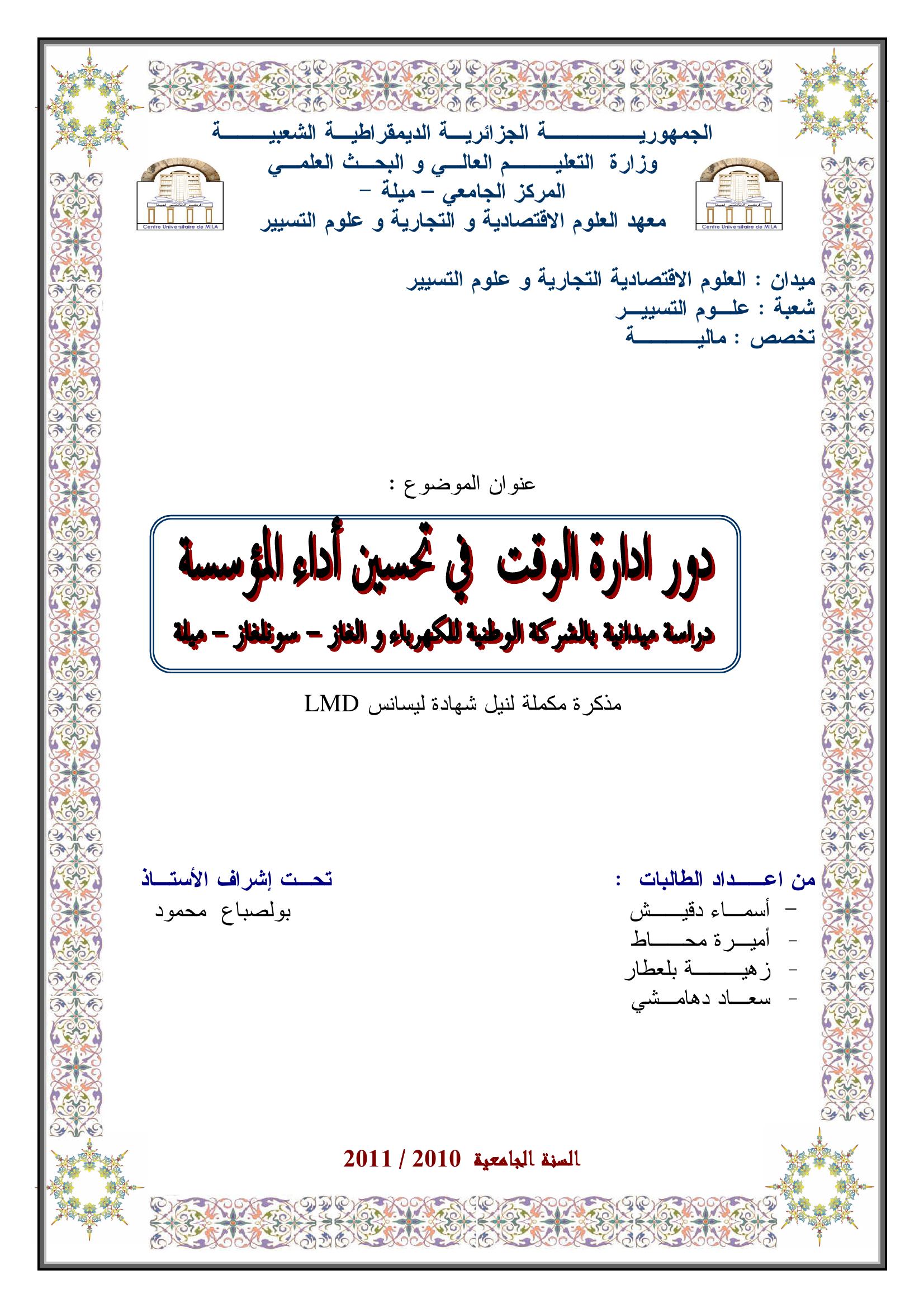 أسماء دقيش & بولصباع محمود (مشرفا) (2011). دور إدارة الوقت في تحسين أداء المؤسسة دراسة ميدانية بالشركة الوطنية للكهرباء والغاز - سونلغاز -ميلة.