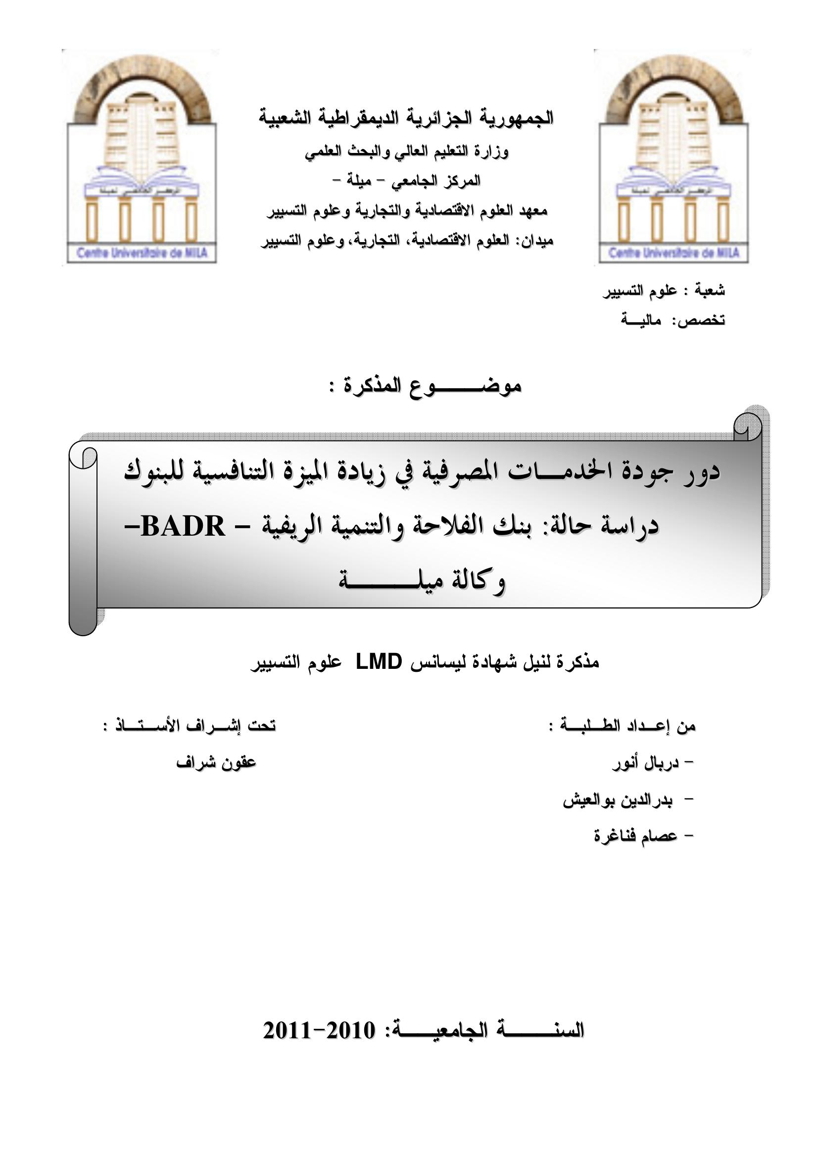 أنور دربال & عقون شراف(مشرفا) (2011). دور جودة الخدمات المصرفية في زيادة الميزة التنافسية للبنوك: دراسة حالة بنك الفلاحة والتنمية الريفية badr - وكالة ميلة -.