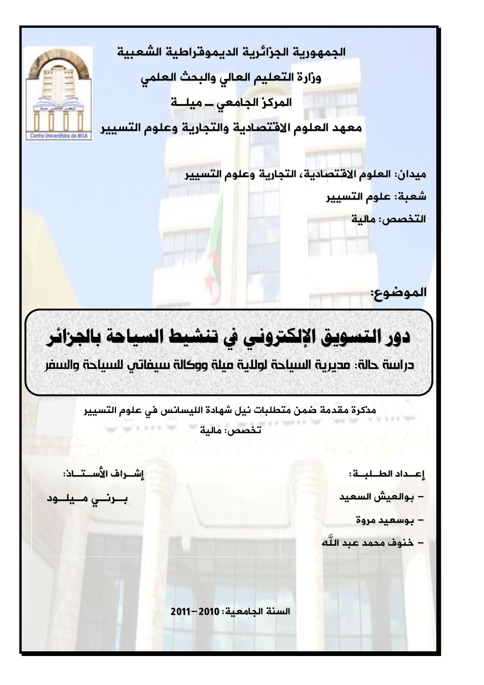 بوالعيش السعيد & برني ميلود (مشرفا) (2011). دور التسويق الإلكتروني في تنشيط السياحة في الجزائر دراسة حالة مديرية السياحة لمديرية ميلة ووكالة سيفاتي للسياحة والسفر.