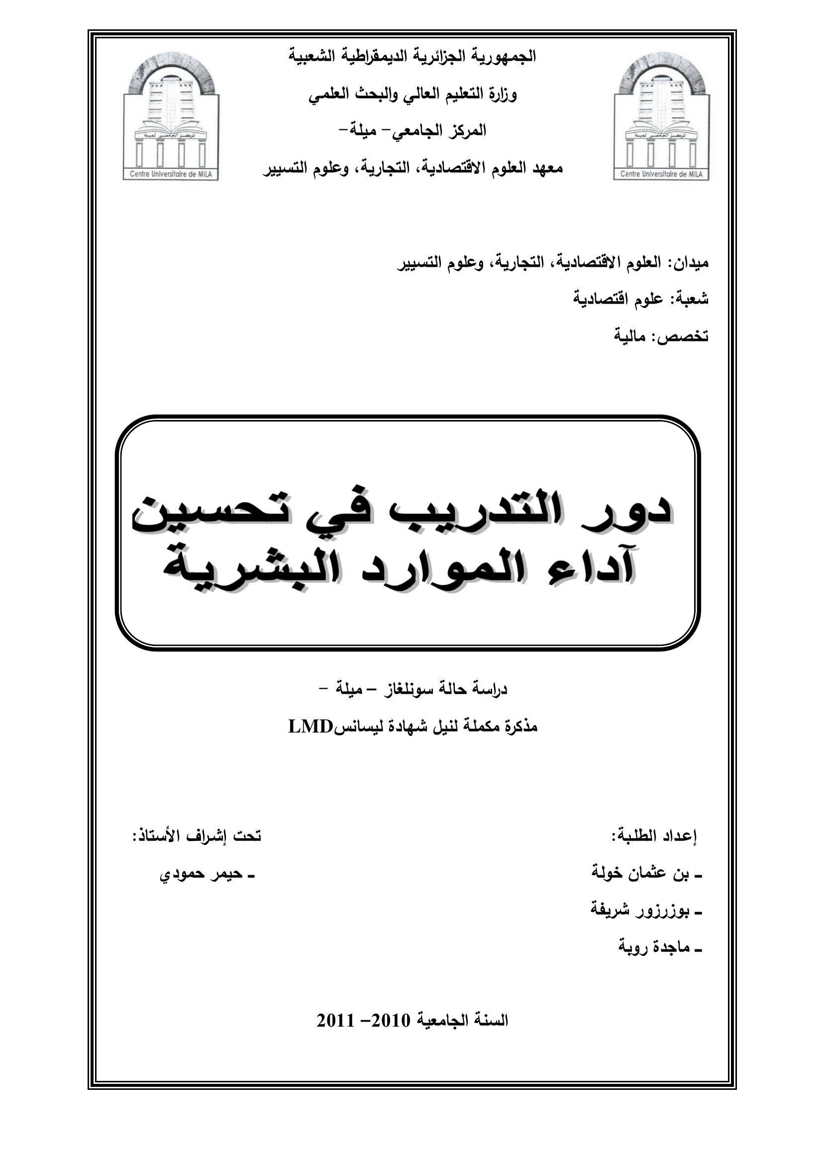 بن عثمان خولة & حيمر حمودي (مشرفا) (2011). دور التدريب في تحسين أداء الموارد البشرية دراسة : حالة سونلغاز - ميلة -.