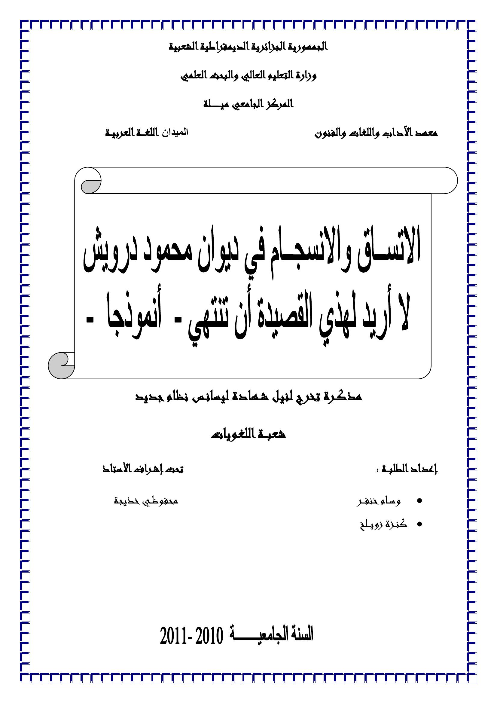 الاتساق و الانسجام في ديوان محمود درويش"لا أريد لهذي القصيدة ان تنتهي"-أنمودجا-