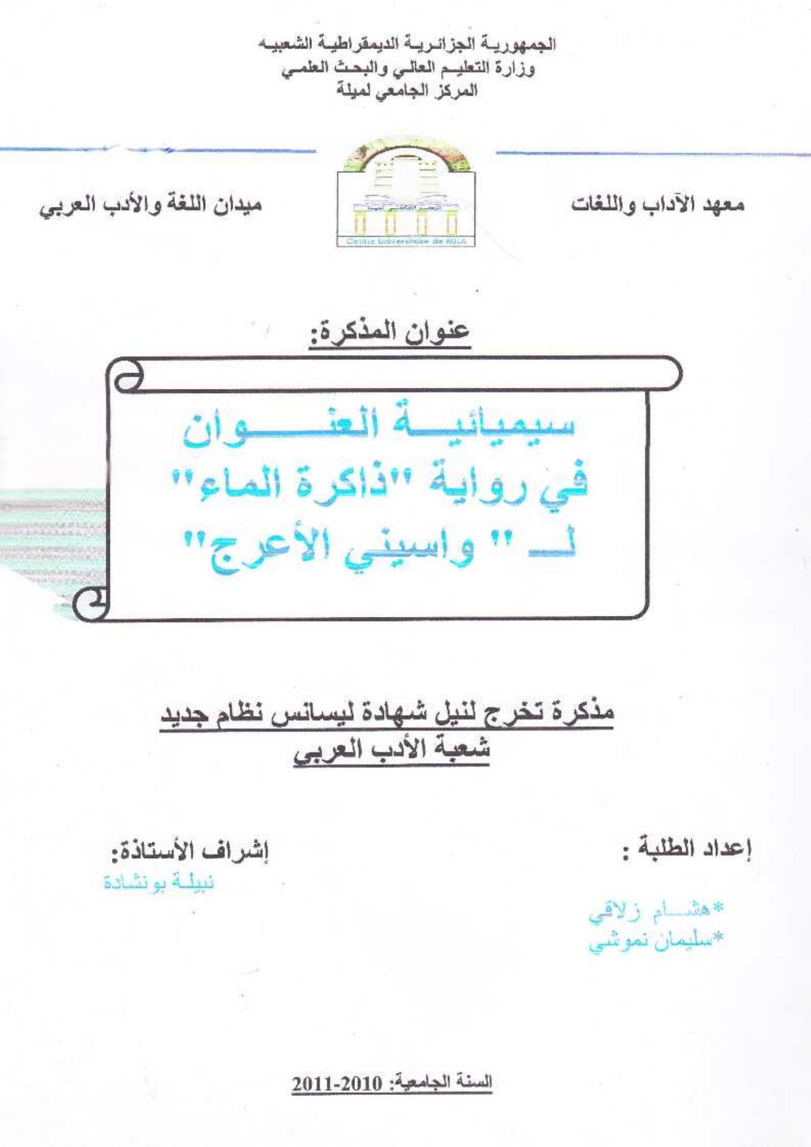 هشام زلاقي et al. (2011). سيميائية العنوان في رواية"ذاكرة الماء"ل "واسيني الأعرج".