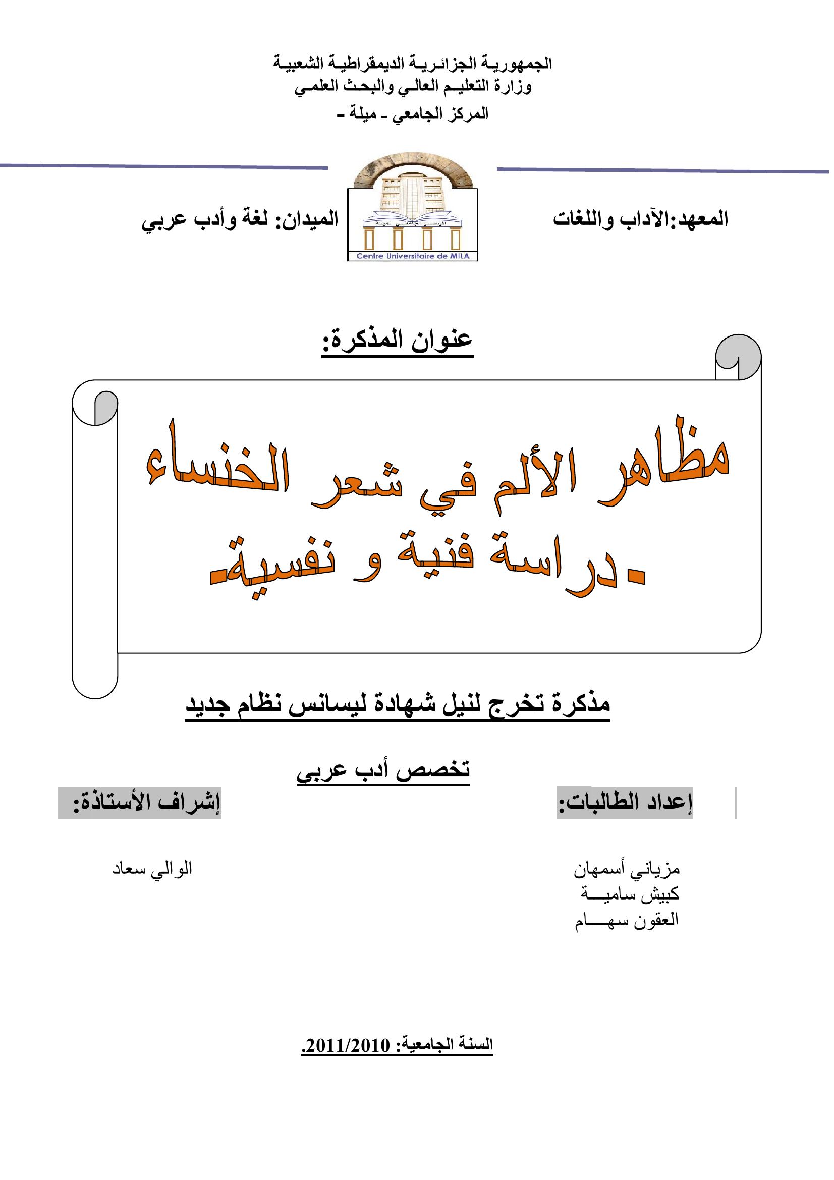 مزياني أسمهان et al. (2011). مظاهر الألم في شعر خنساء -دراسة فنية و نفسية-.
