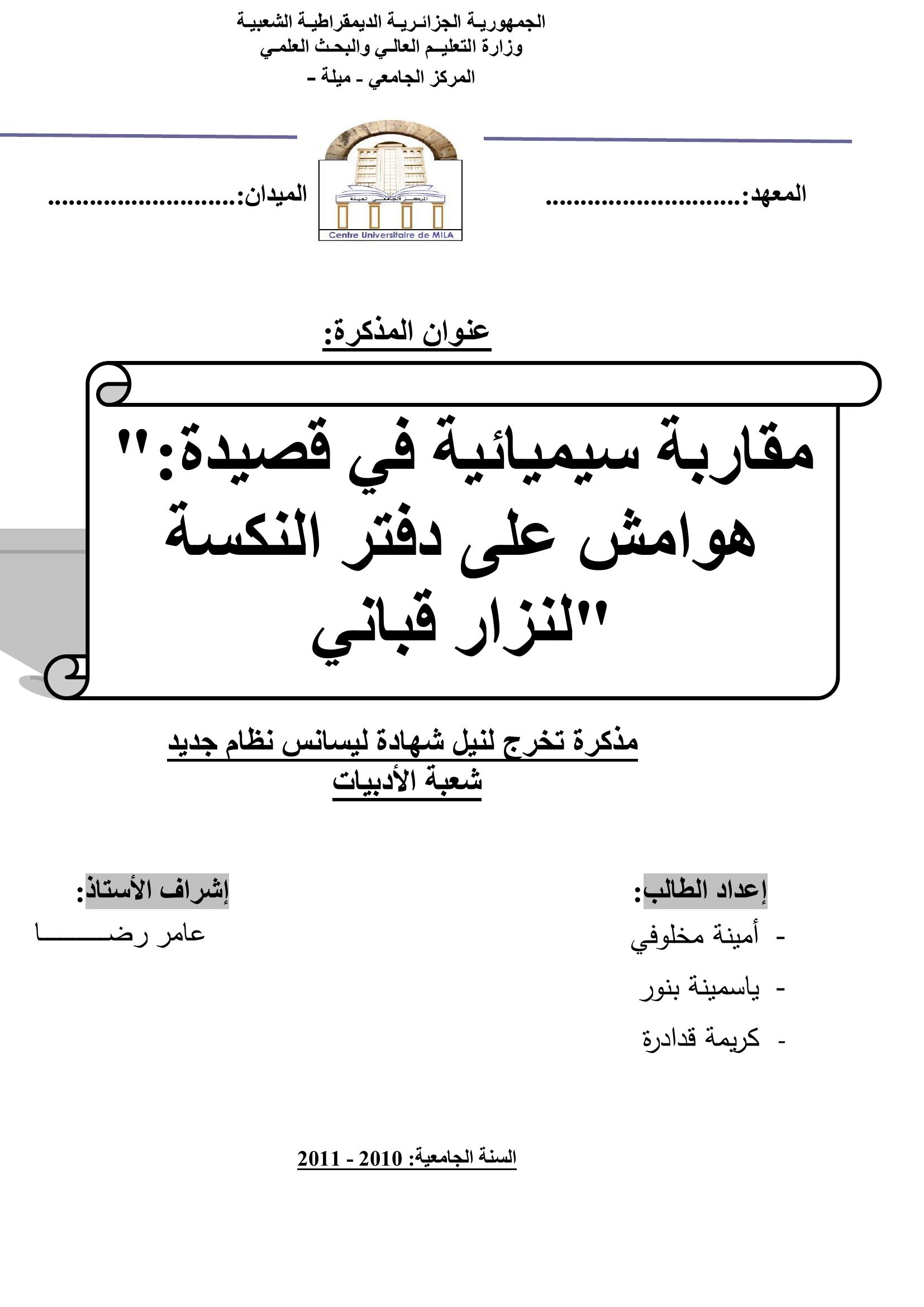 أمينة مخلوفي et al. (2011). مقاربة سيميائية في قصيدة"هوامش على دفتر النكسة" لنزار قباني.