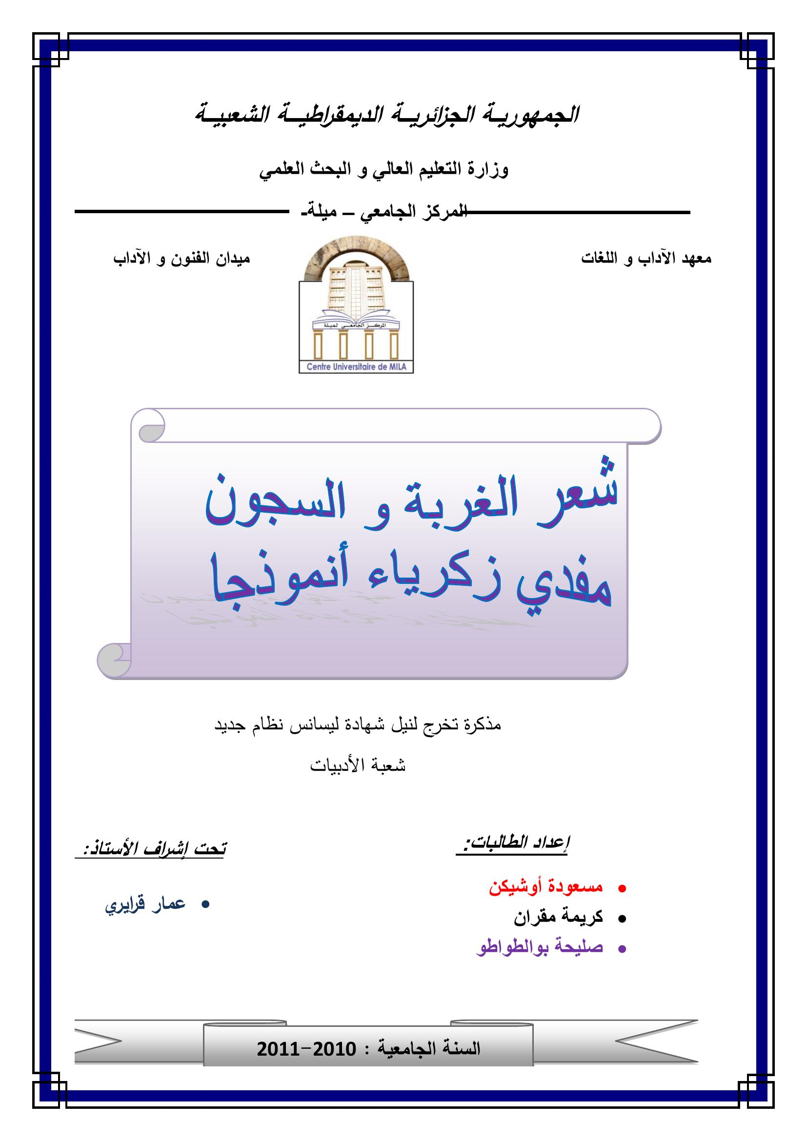 مسعودة أوشيكن et al. (2011). شعر الغربة و السجون "مفدي زكرياء"أنمودجا".