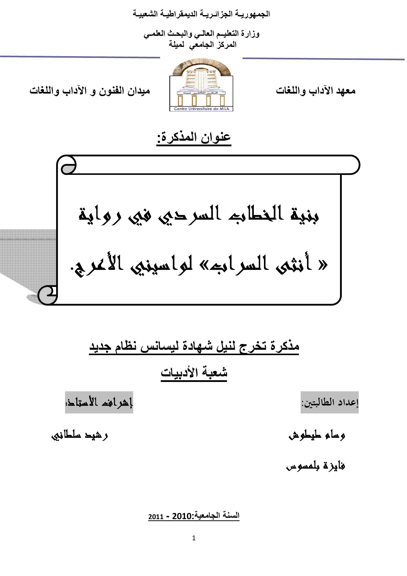 وسام طيطوش et al. (2011). بنية الخطاب السردي في رواية "أنثى السراب" لواسيني الأعرج..