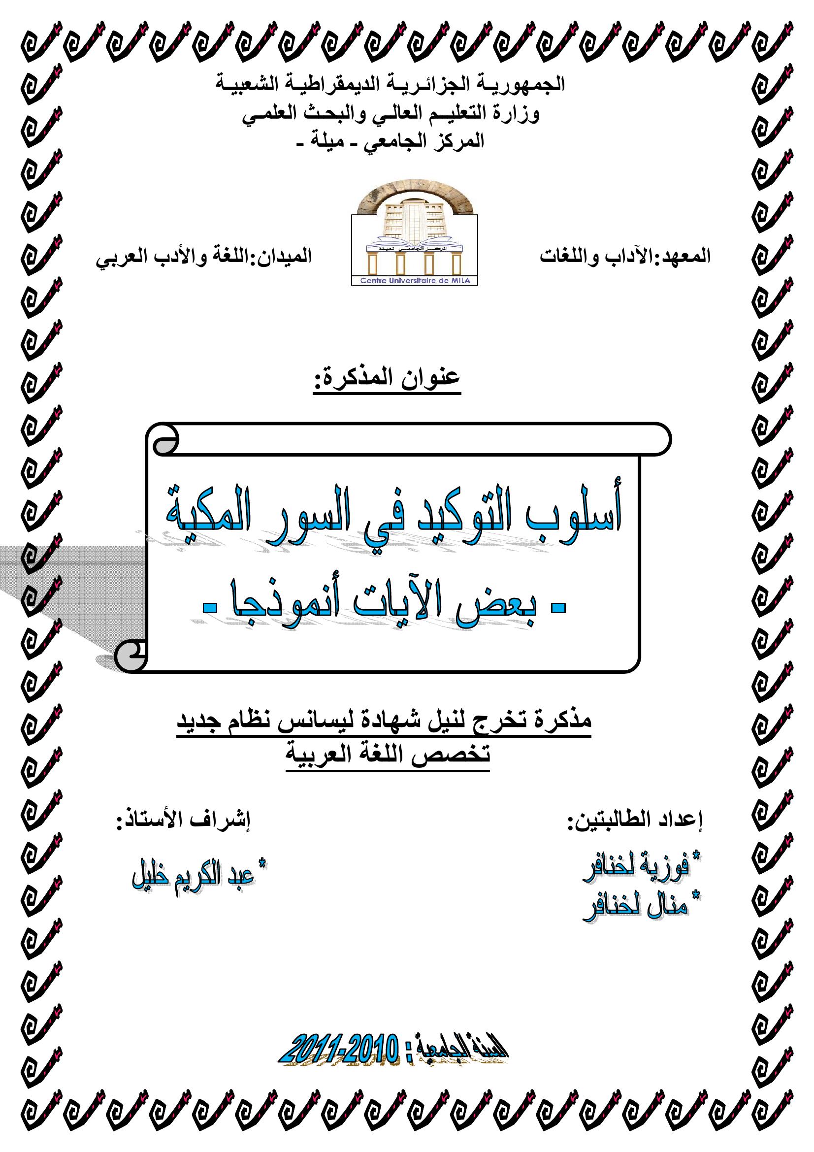 فوزية لخنافر et al. (2011). أسلوب التوكيد في السور المكية-بعض الآيات أنموذجا.