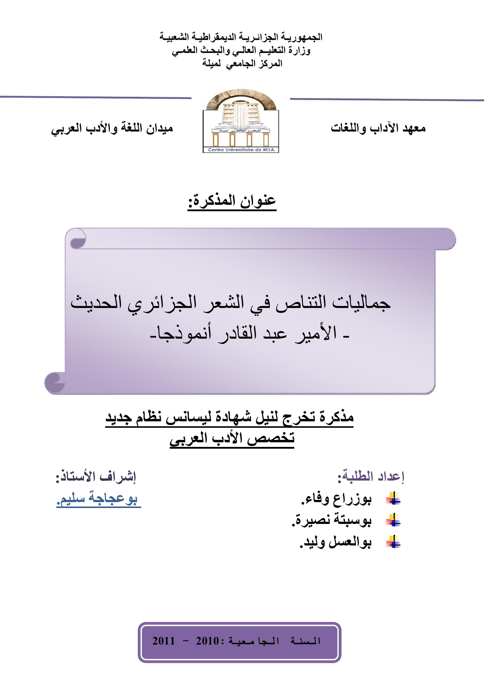 بوزراع وفاء et al. (2011). جماليات التناص في الشعر الجزائري الحديث-الأمير عبد القادر أنموذجا-.