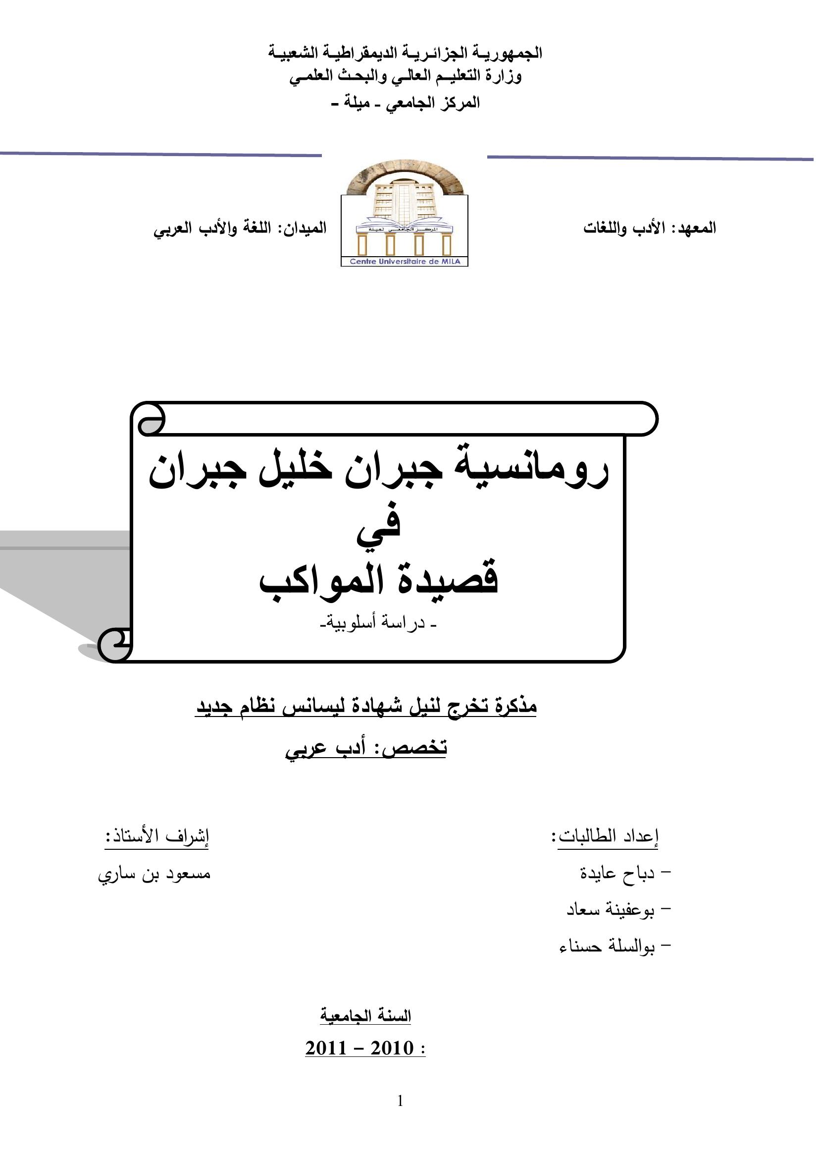 دباح عايدة et al. (2011). رومانسية جبران خليل جبران في قصيدة المواكب.