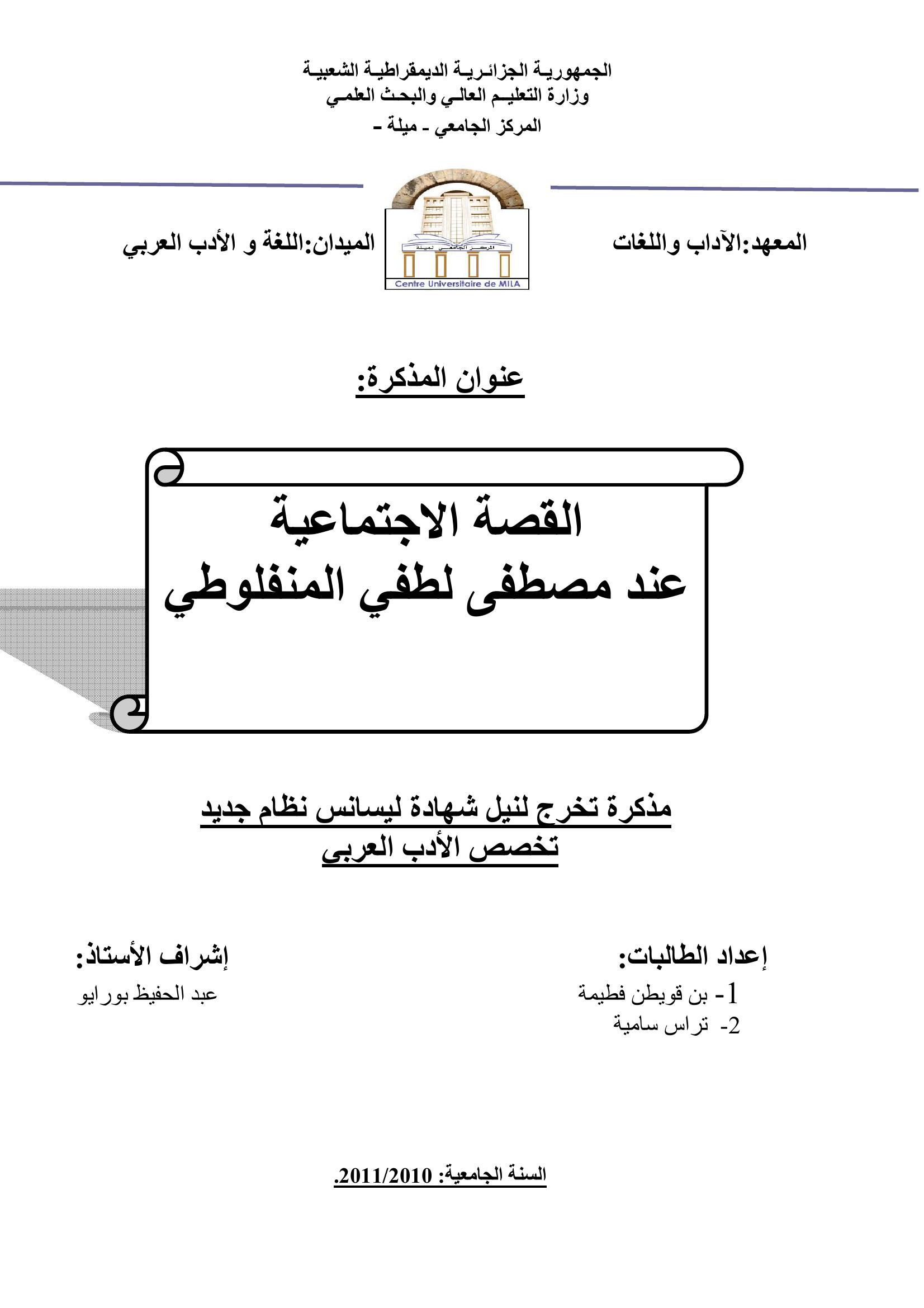 بن قويطن فطيمة et al. (2011). القصة الإجتماعية عند مصطفى لطفي المنفلوطي.
