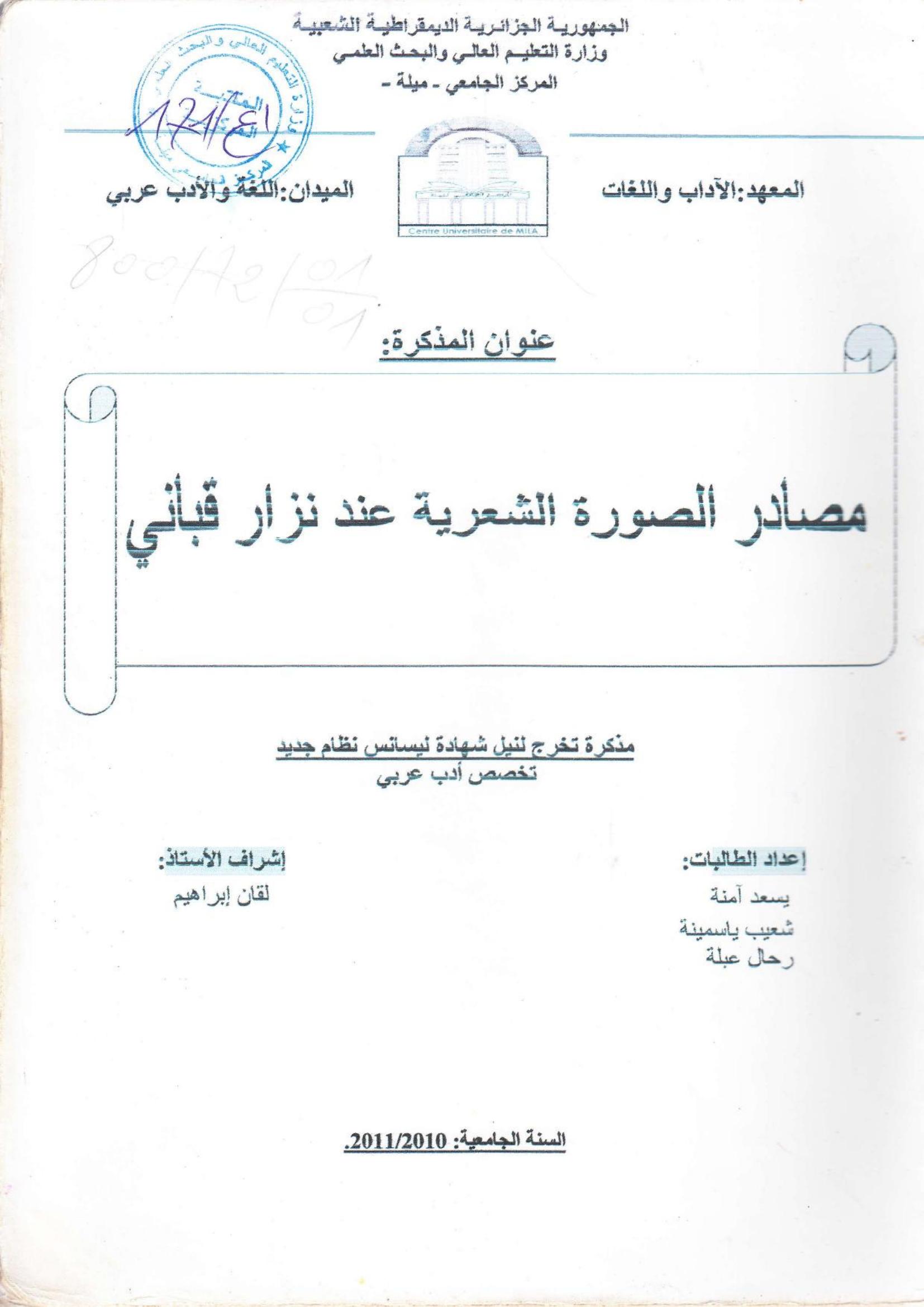يسعد آمنة et al. (2011). مصادر الصورة الشعرية عند نزار قباني.