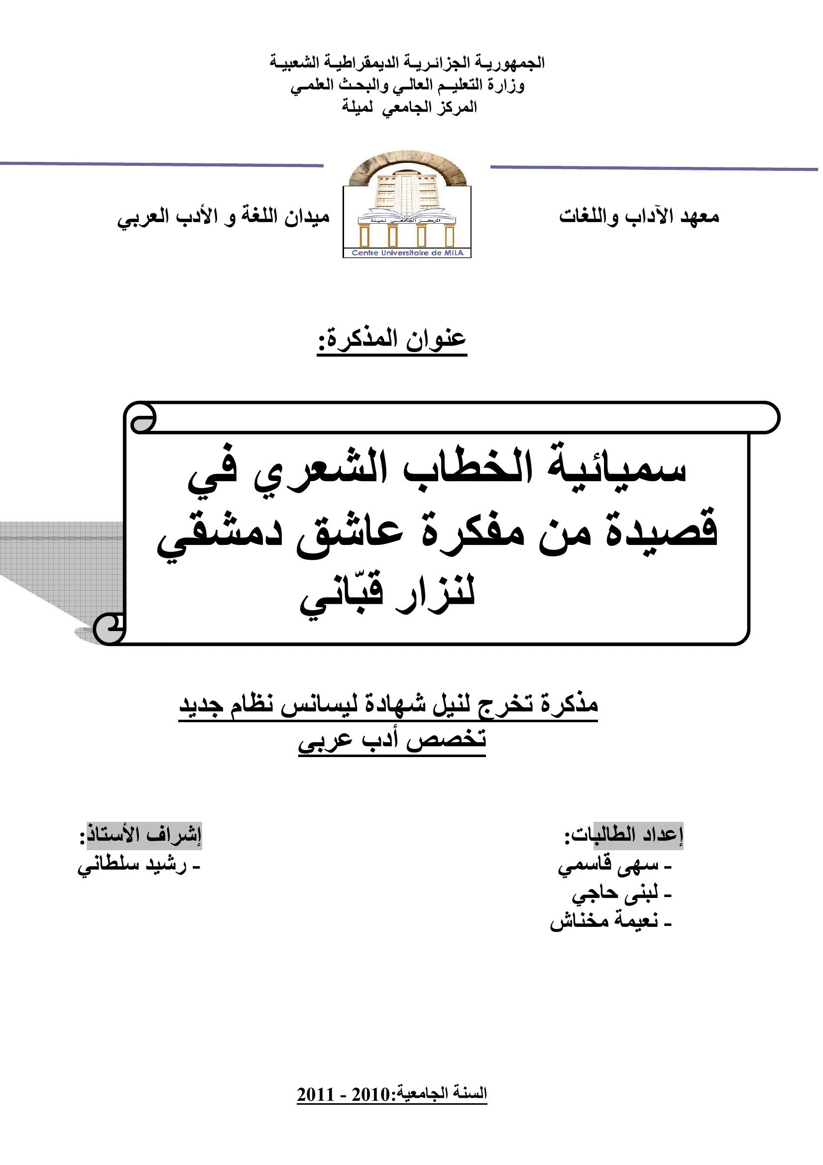سهى قاسمي et al. (2011). سميائية الخطاب الشعري في قصيدة من مفكرة عاشق دمشقي لنزار قباني.