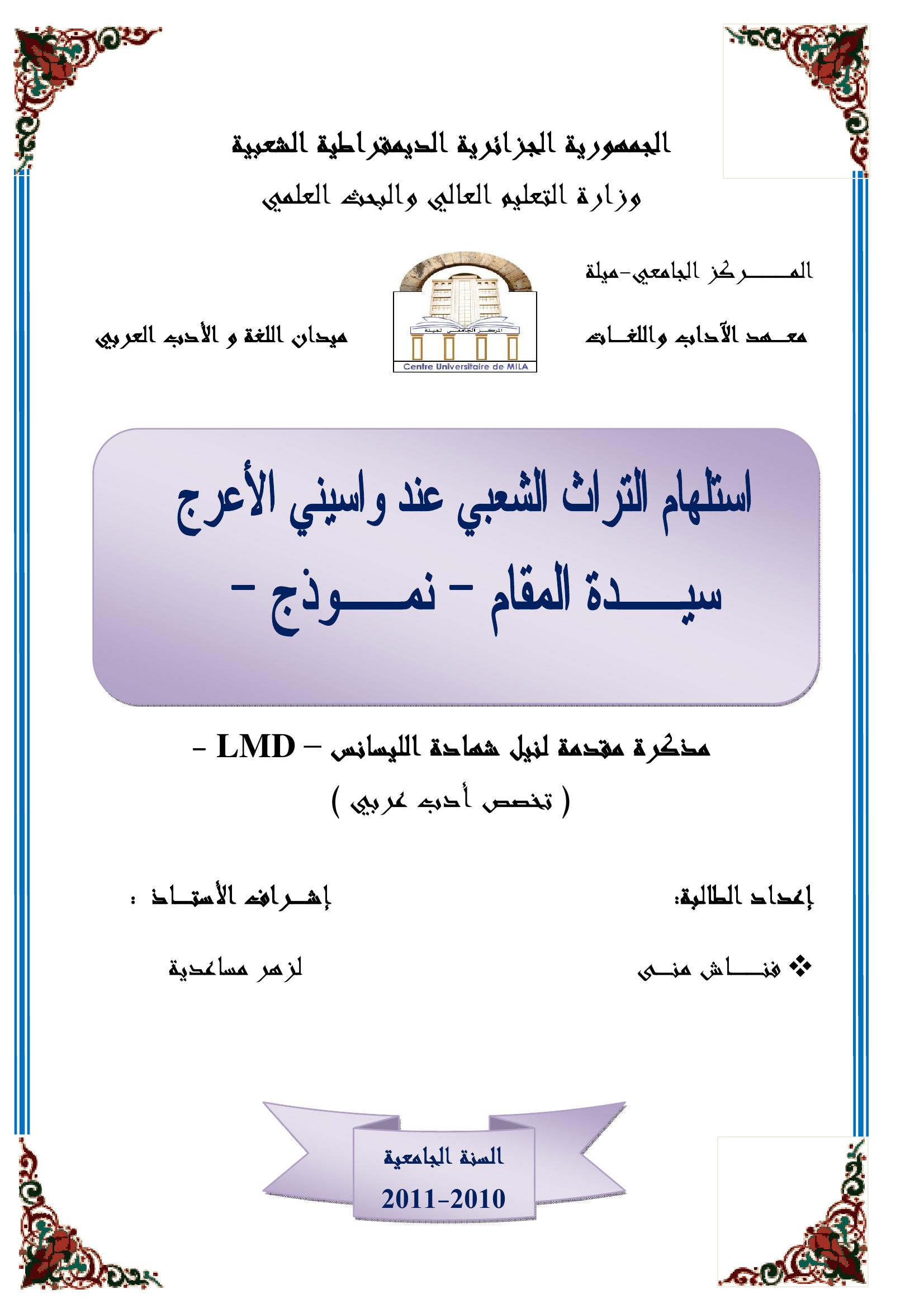 فناش منى & مساعدية لزهر (مشرفا) (2011). استلهام التراث الشعبي عند واسيني االأعرج.