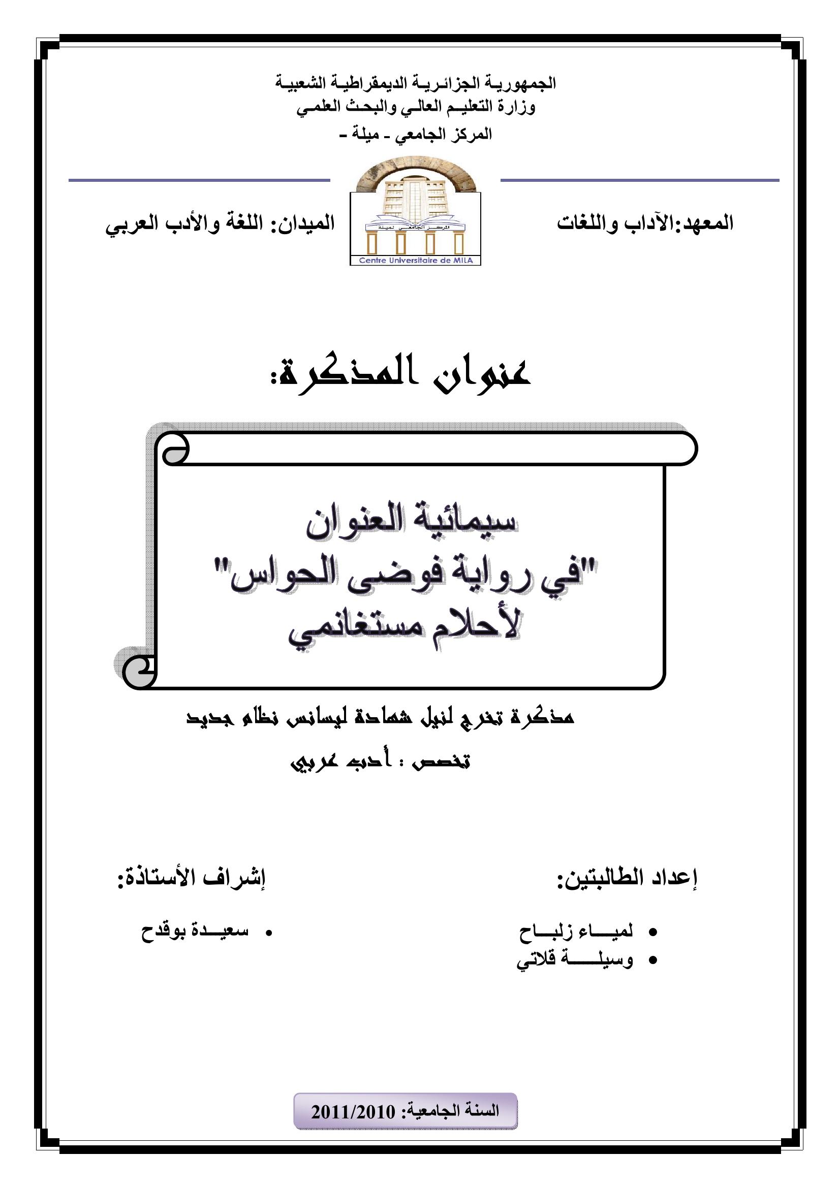 لمياء زلباح et al. (2011). سيميائية العنوان" في رواية فوضى الحواس " لأحلام مستغانمي.