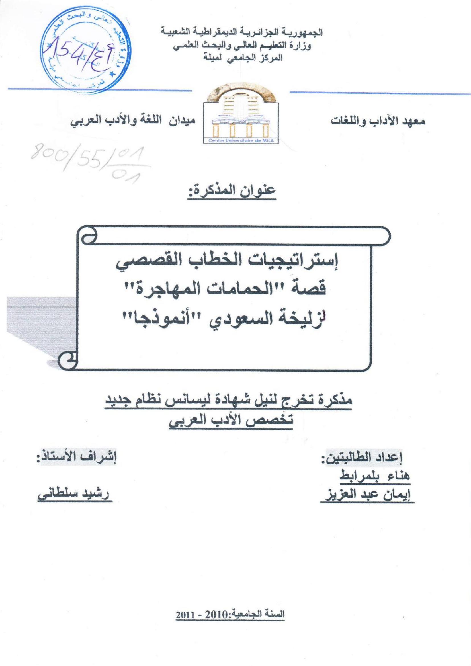 هناء بلمرابط et al. (2011). أستراتيجيات الخطاب القصصي قصة"الحمامات المهاجرة"لزليخة السعودي"أنكوذجا".