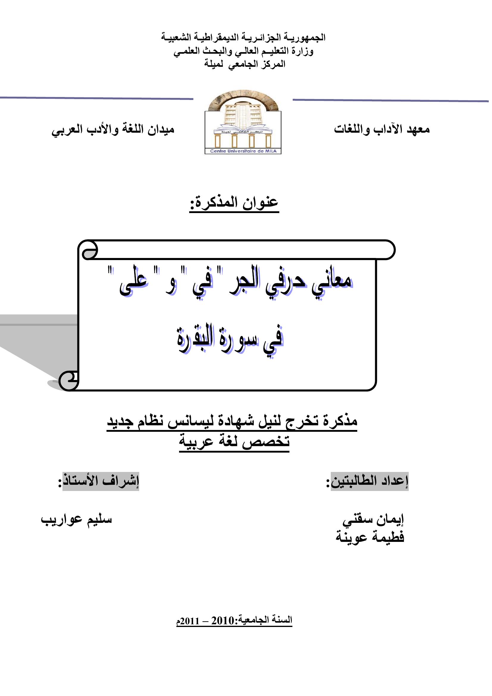 إيمان سقني et al. (2011). معاني حرفي الجر"في"و"على"في سورة البقرة.