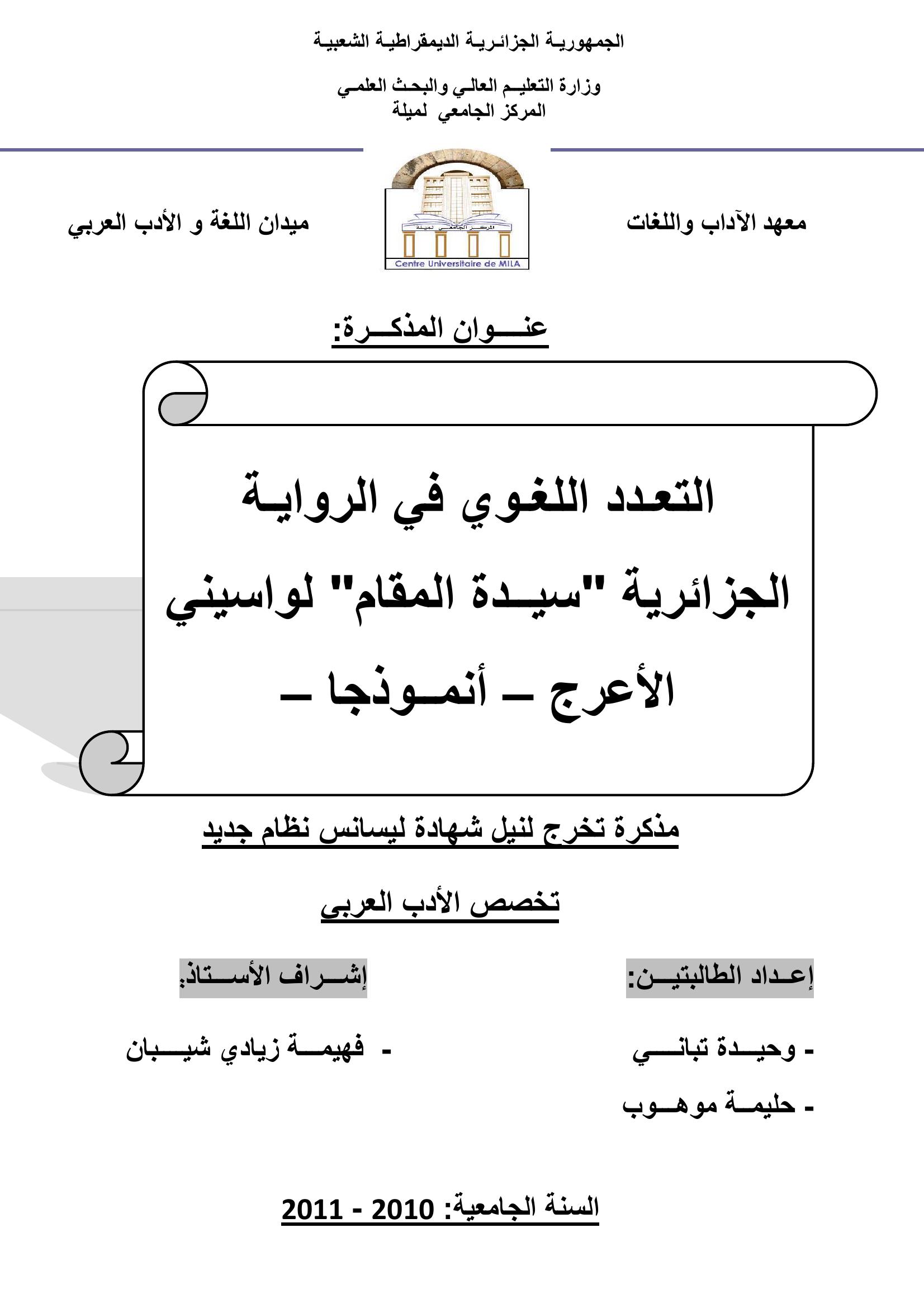وحيدة تباني et al. (2011). التعدد اللغوي في الرواية الجزائرية"سيدة المقام"لواسيني الأعرج-أنموذجا-.