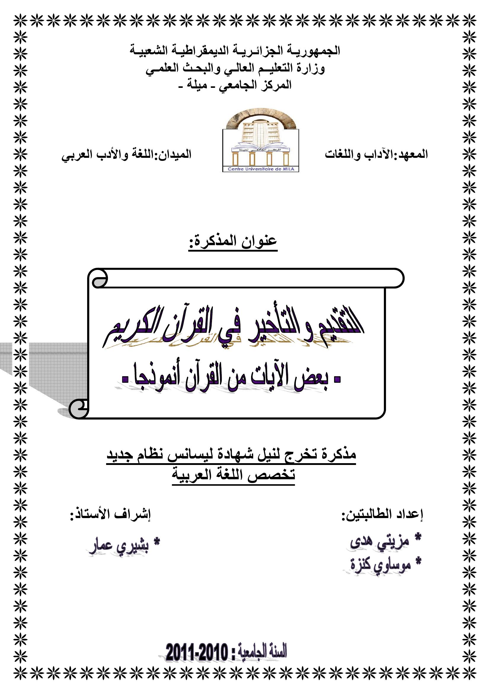 مزيتي هدي et al. (2011). التقديم والتـأخير في القرآن الكريم بعض اللآيات من القرآن أنموذجا-.