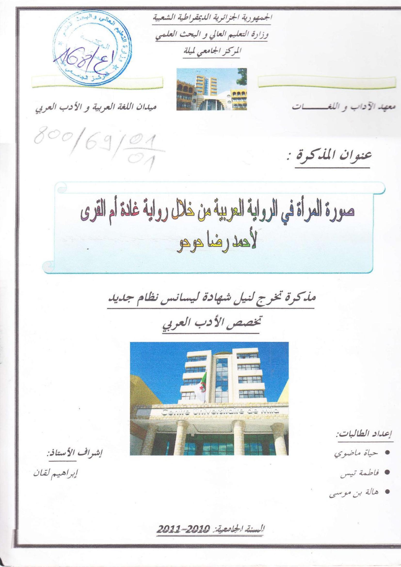 حياة ماضوي et al. (2011). صورة المرأة في الرواية العربية من خلال رواية غادةأم القرى لأحمد رضا حوحو.