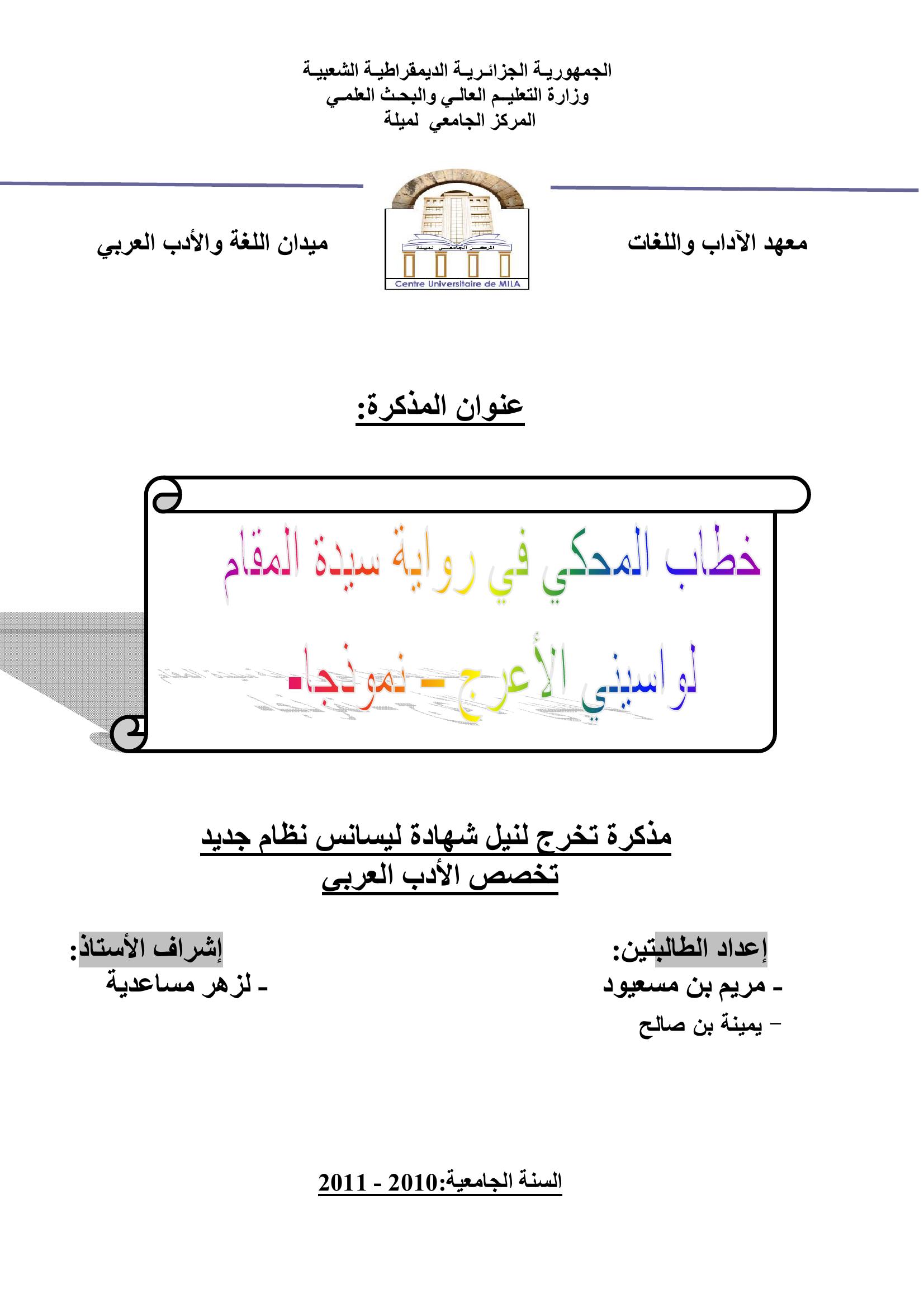 مريم بن مسيعود et al. (2011). خطاب المحكي في رواية سيدة المقام لواسيني الأعرج-نموذجا-.