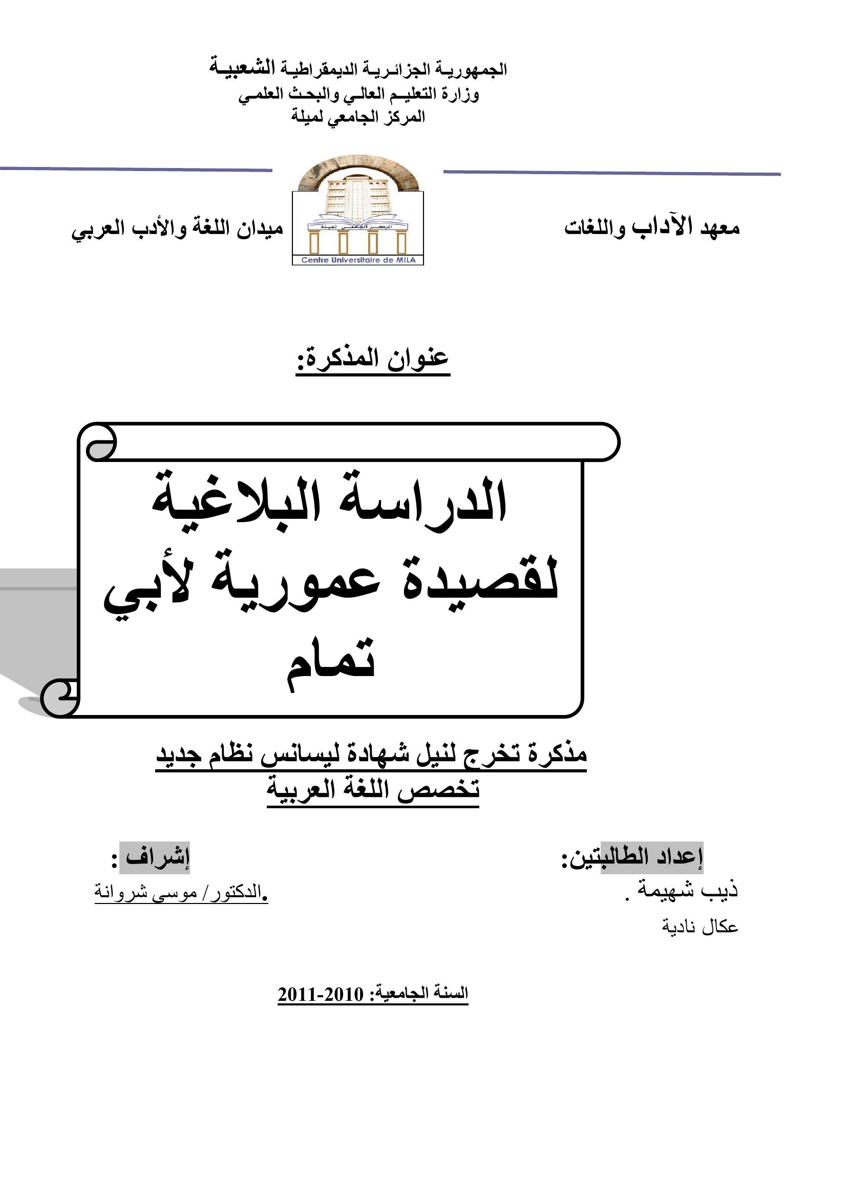 ذيب شهيمة et al. (2011). الدراسة البلاغية لقصيدة عمورية لأبي تمام.