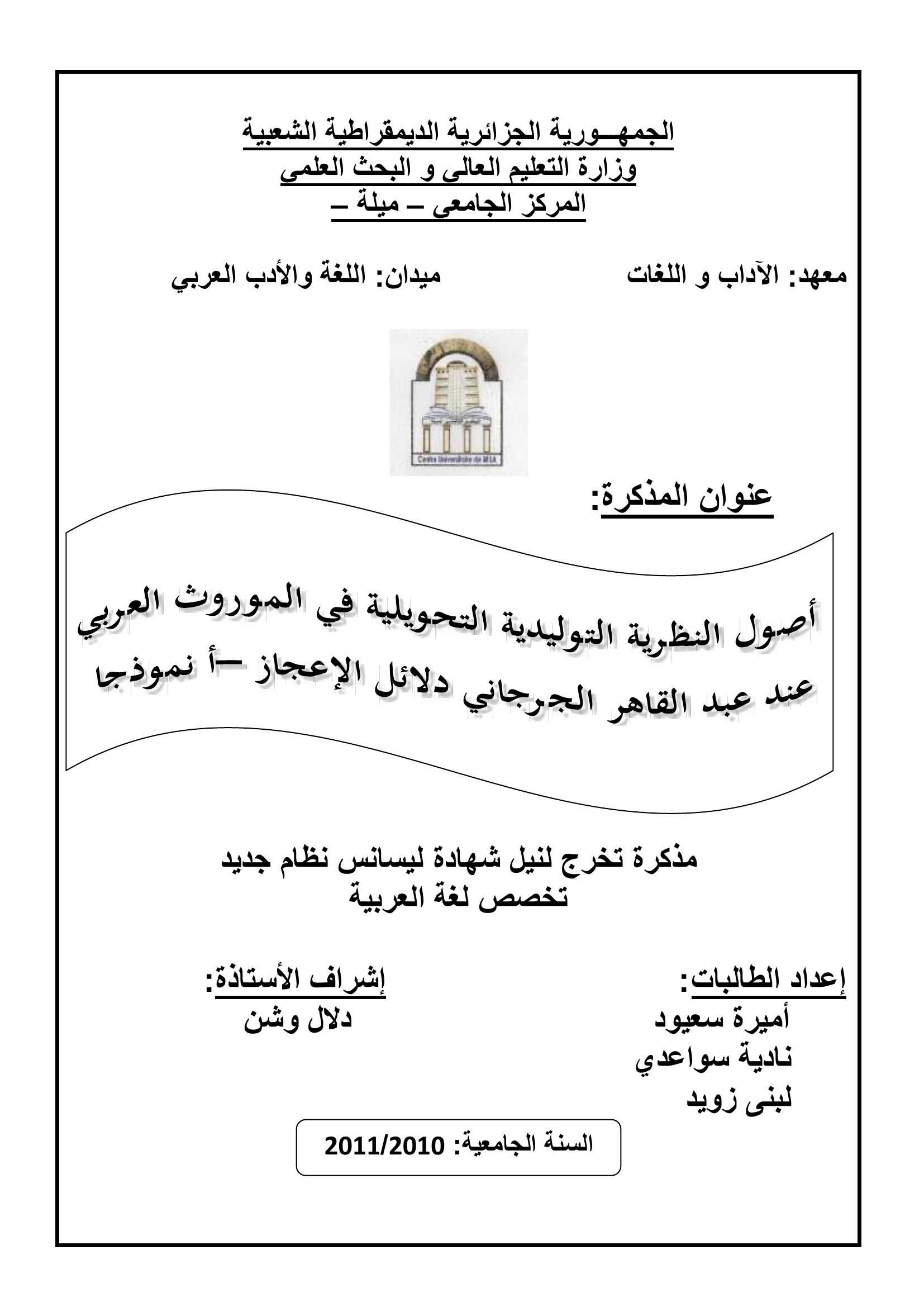 أميرة سعيود & وشن دلال (مشرفا) (2011). أصول النظرية التوليدية التحويلية الموروث العربي.