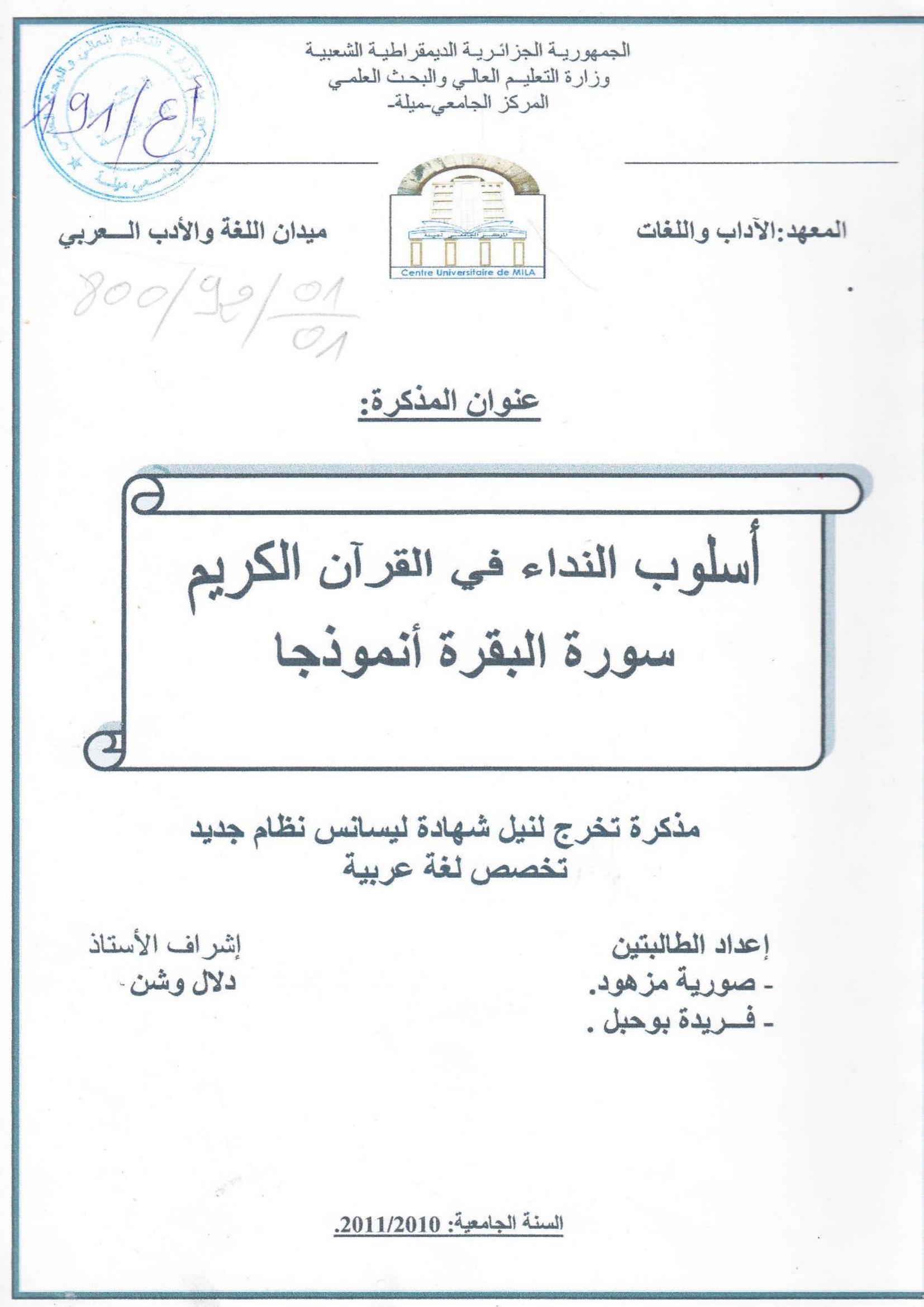 سورية مزهود et al. (2011). أسلوب النداء في القران الكريم سورة البقرة أنمودجا.