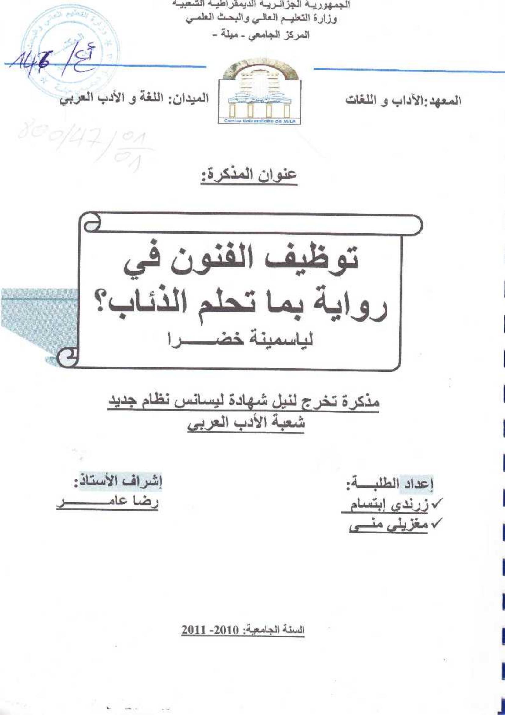زرندي ابتسام et al. (2011). توظيف الفنون في رواية بما تحلم الذئاب؟لياسمينة خضرا.