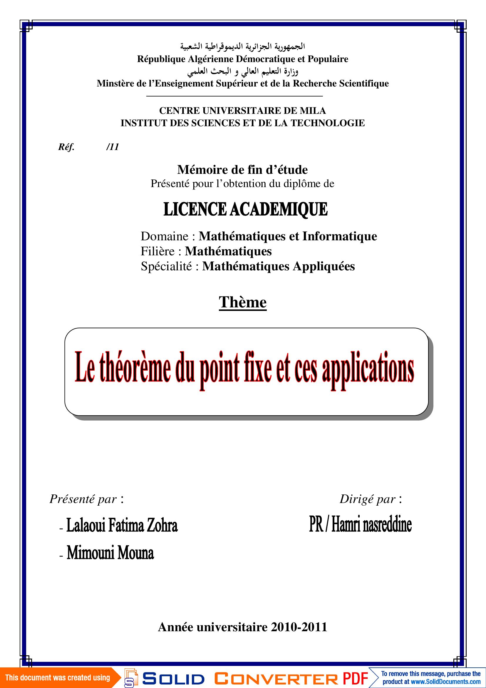Lalaoui fatima zohra & hamri nasreddine encadreur (2011). Le théorème du point fixe et ces applications.