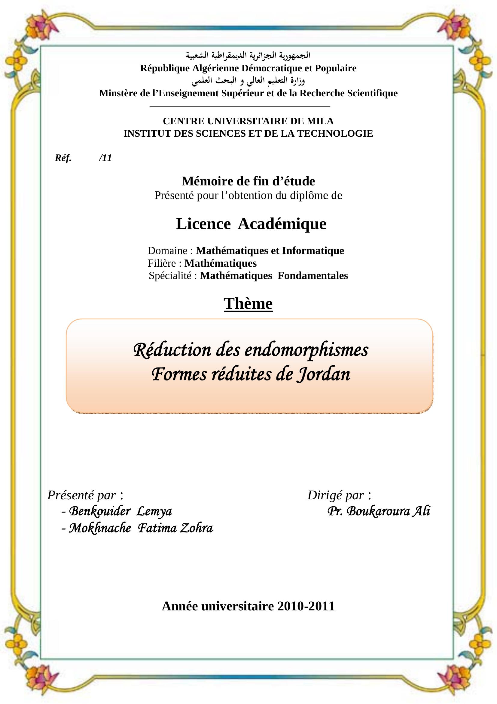 Benkouider Lemya & Boukaroura khelladi samia encadreur (2011). Réduction des endomorphismes Formes réduites de Jordan.